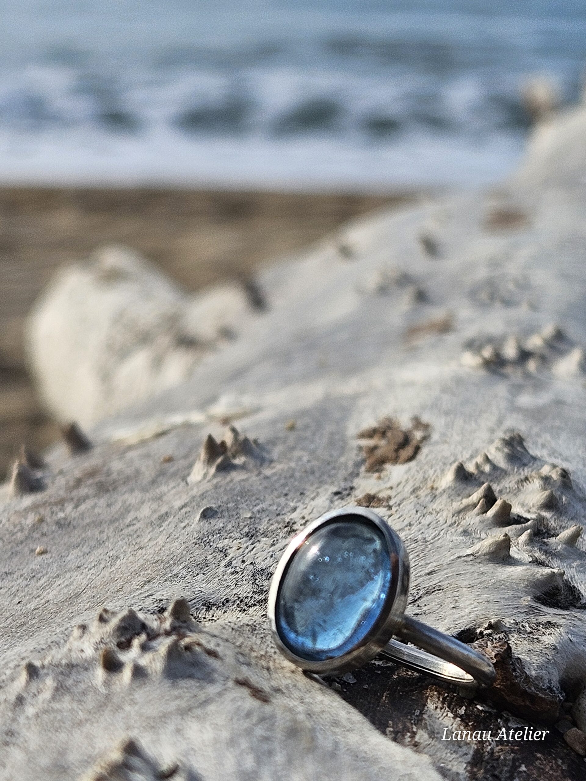 Exclusividad y belleza natural se unen en este anillo diseñado en plata de ley 925, que realza un cabujón ovalado de aguamarina natural. Esta gema única, con su tono azul suave y transparente, aporta un aire fresco y elegante a cualquier estilo.