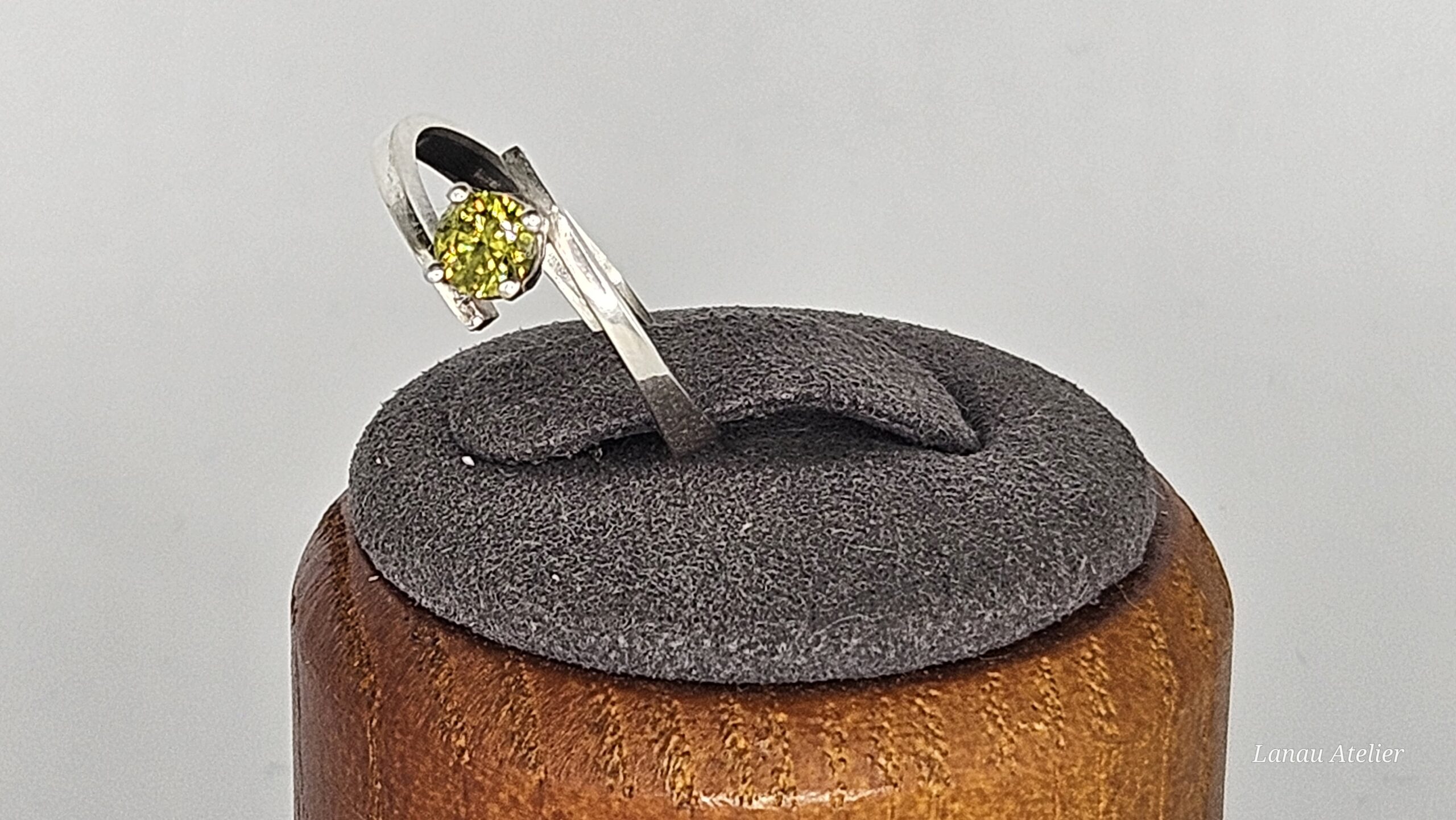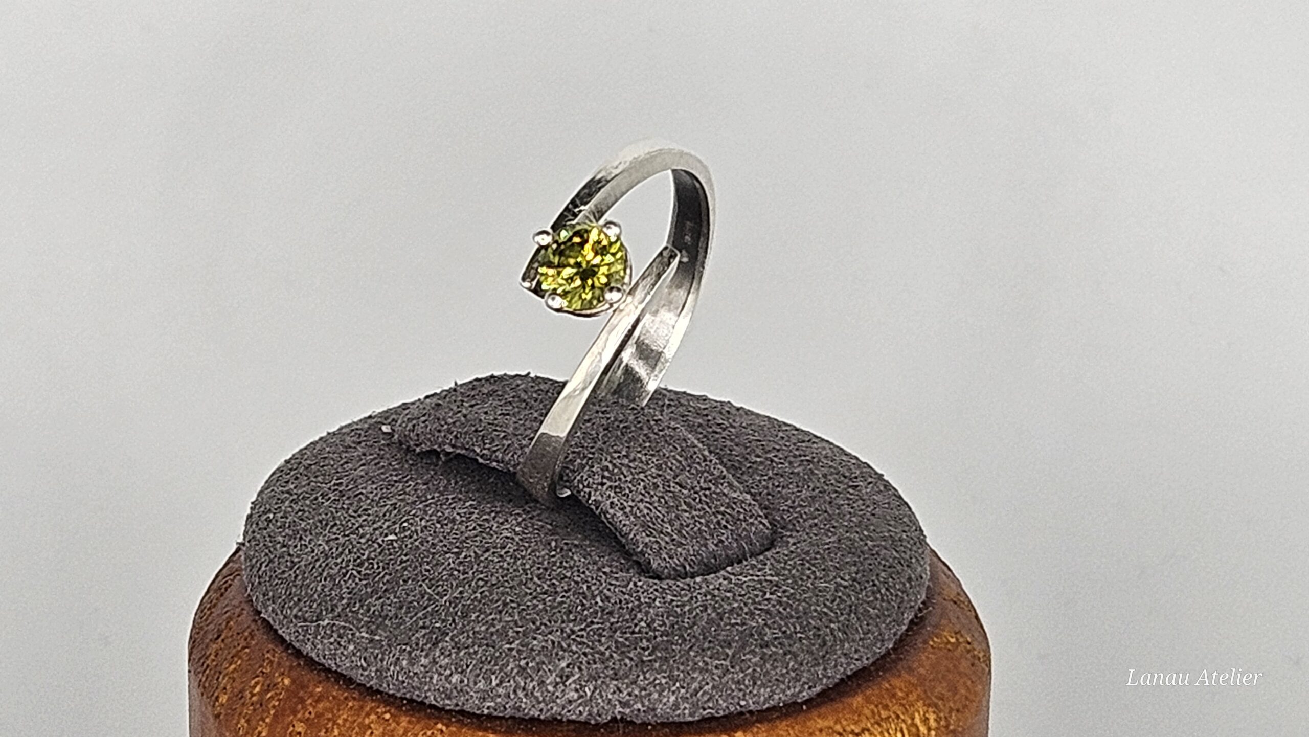 Anillo en forma de espiral elaborado en plata de ley 925, con un diseño en forma de espiral que simboliza movimiento, equilibrio y creatividad. En el centro de cada pieza destaca una circonita Dark Peridot de 4 mm, que aporta un sutil brillo verde oscuro lleno de profundidad y elegancia.
