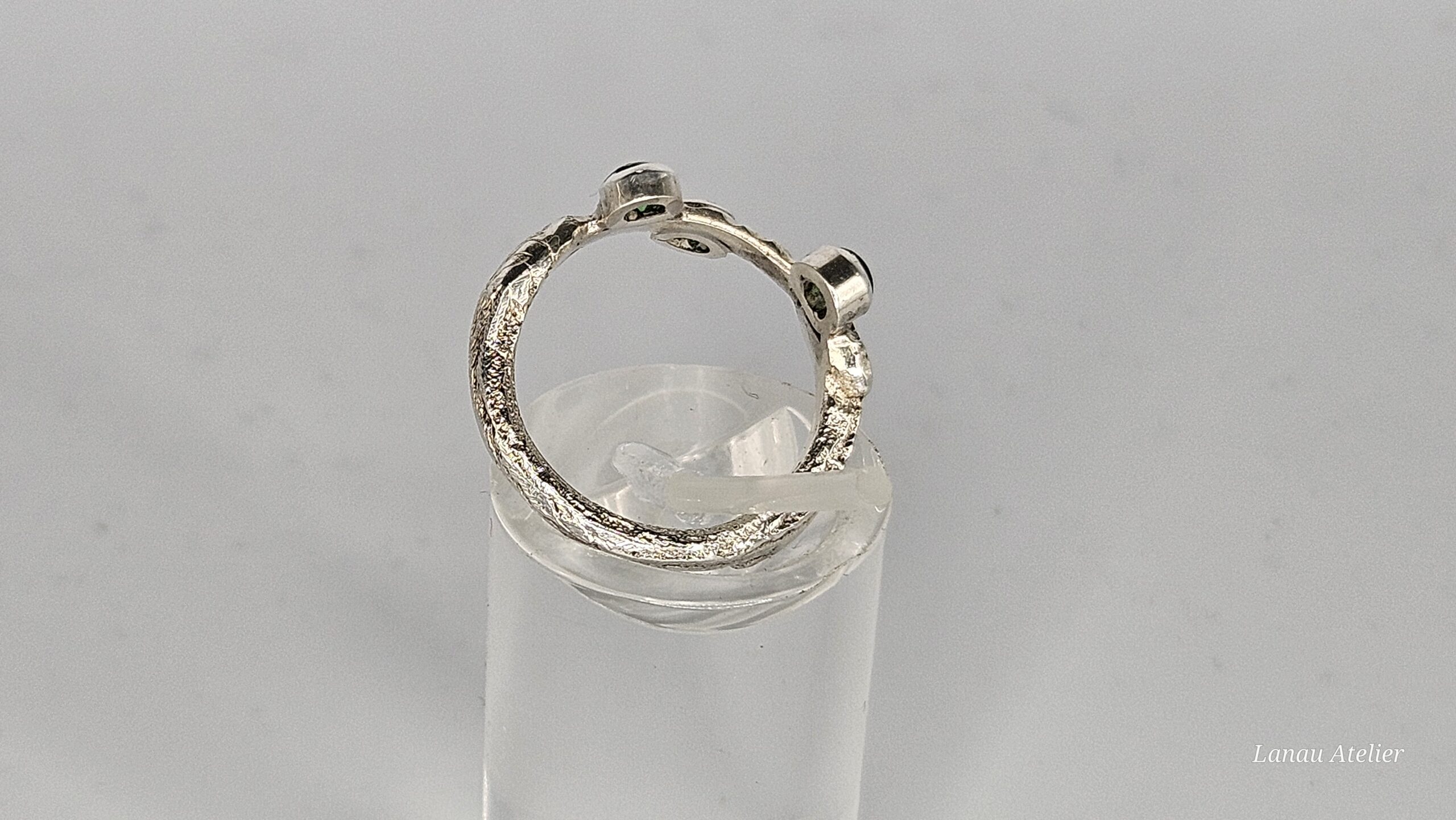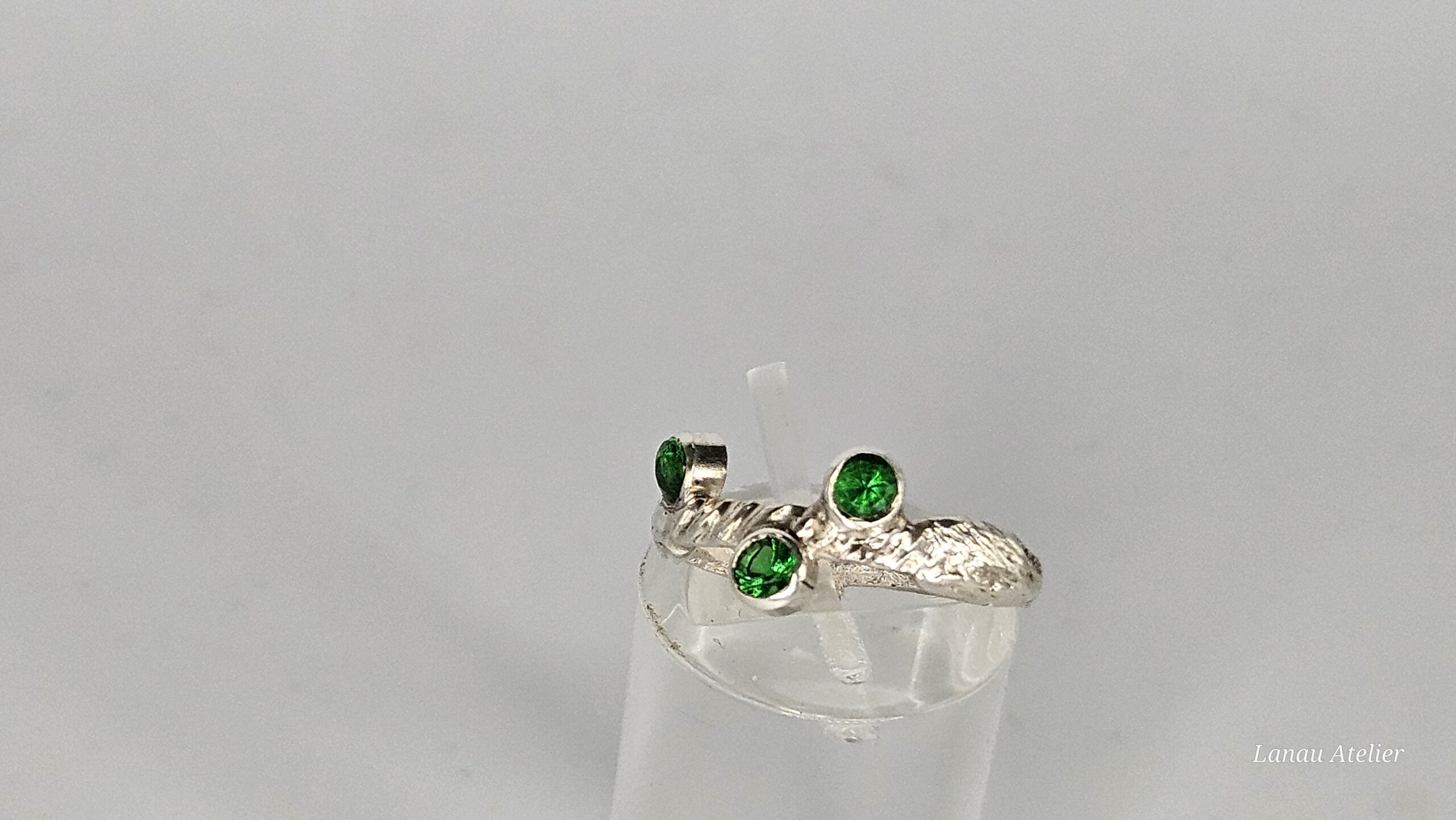 En el centro, tres esmeraldas ecológicas cuidadosamente seleccionadas brillan con un tono verde intenso, evocando frescura, equilibrio y conexión con la Tierra. Estas gemas sostenibles no solo realzan la estética del anillo, sino que también reflejan un compromiso con el respeto al medio ambiente.