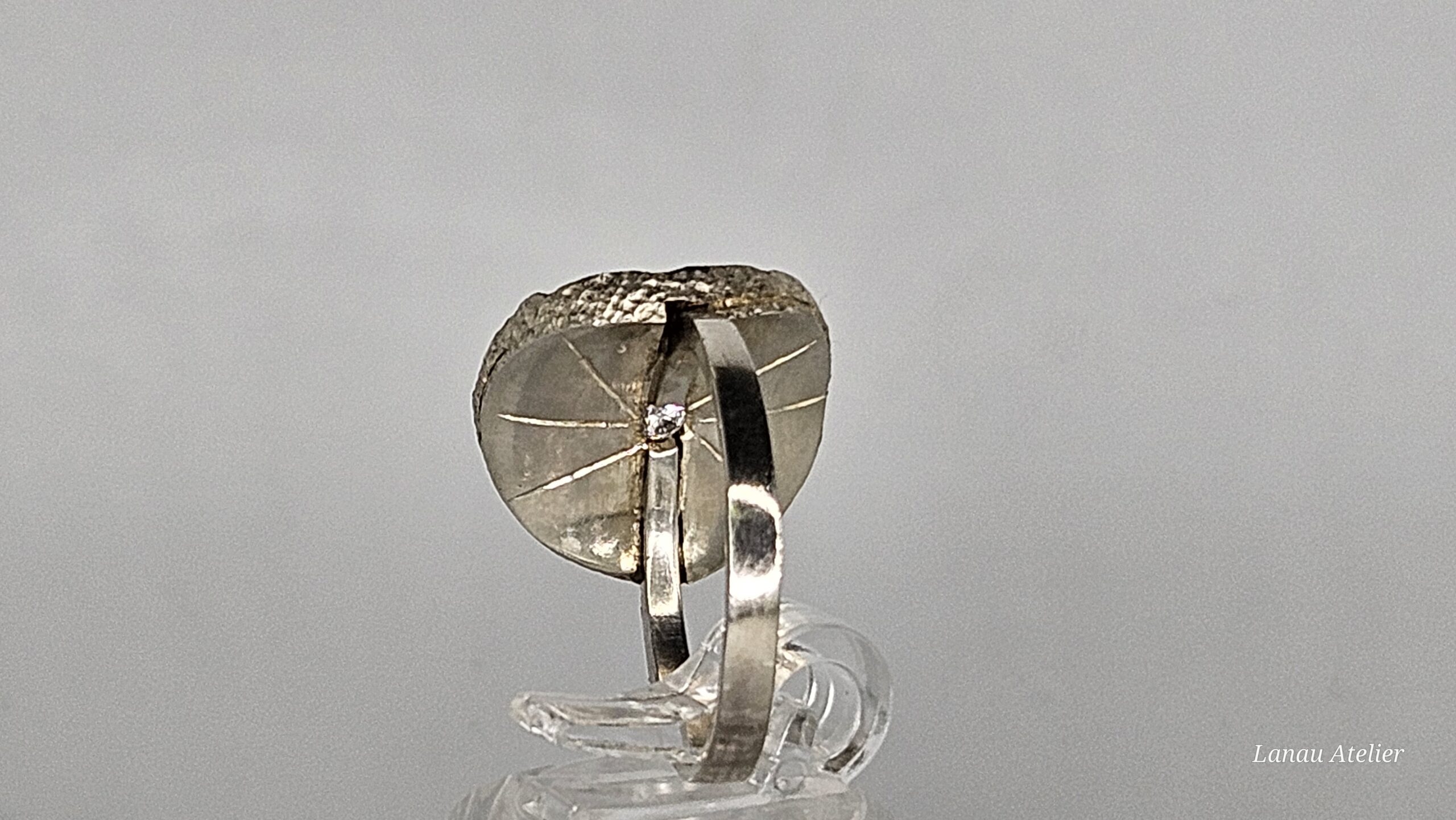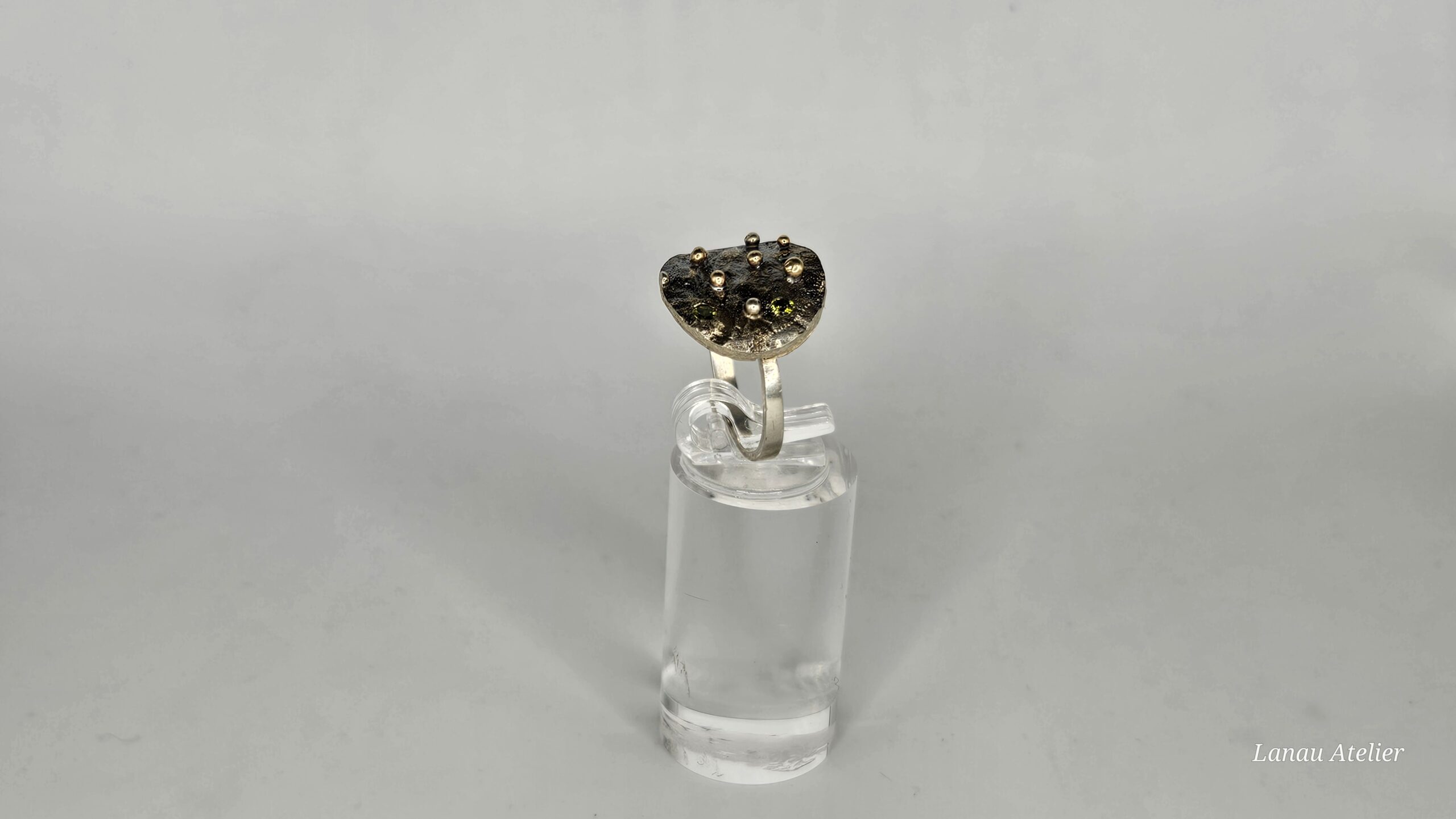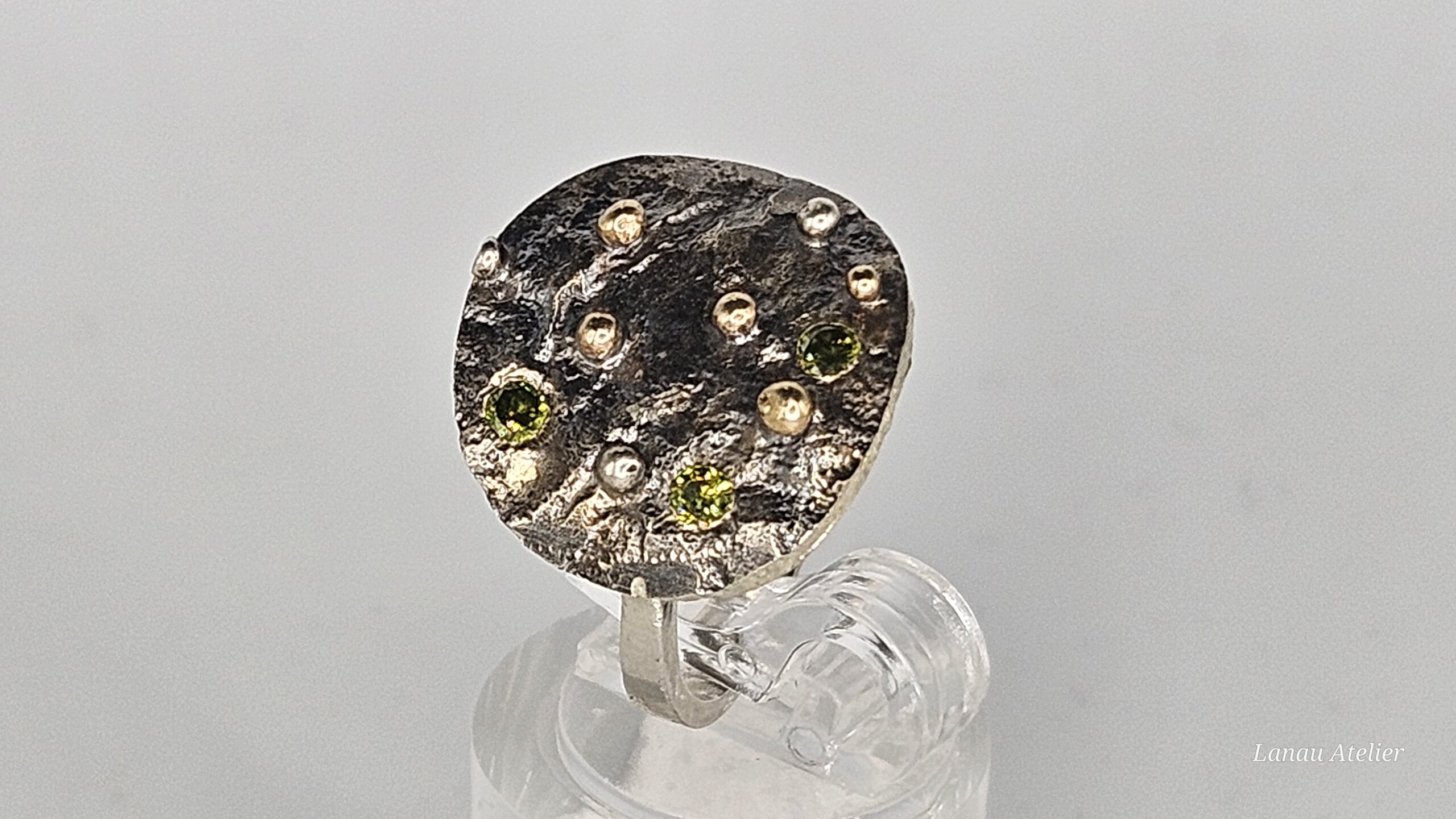 Una joya exclusiva que fusiona la nobleza de la plata de ley con la calidez del oro 18K. La superficie texturizada mediante la técnica de plata reticulada aporta un acabado orgánico y sofisticado. En la parte inferior, un delicado detalle de circonita ilumina la pieza, mientras que tres circonitas Dark Peridot decoran la superficie, otorgando un toque de color profundo y misterio.