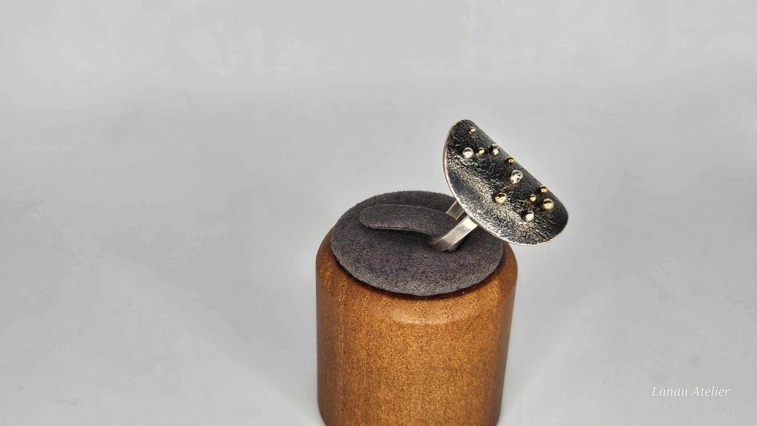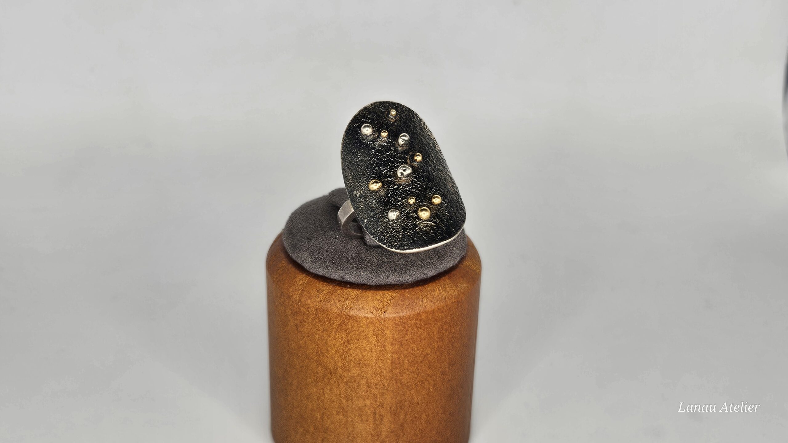 Los detalles en oro 18K están cuidadosamente integrados para añadir un contraste cálido y sofisticado, iluminando el anillo con destellos de lujo sutil. Estos toques dorados realzan la belleza natural de la plata reticulada y le otorgan un equilibrio perfecto entre rusticidad y elegancia.
