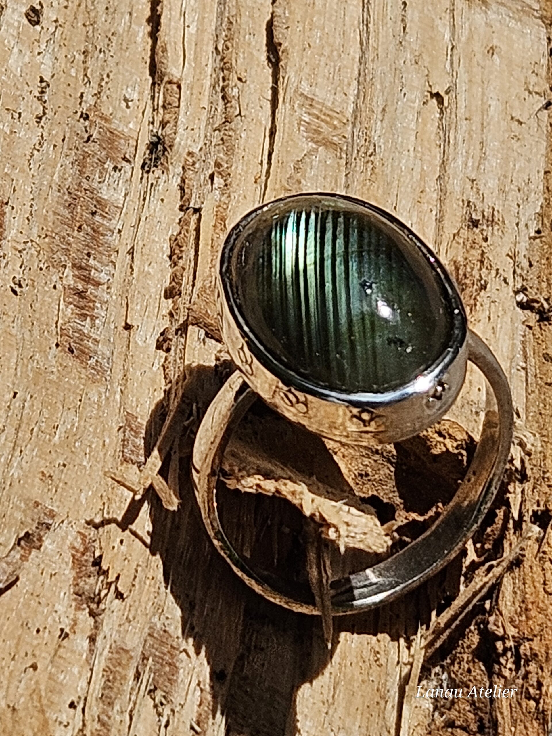 Este anillo artesanal es una pieza exclusiva que destaca por su combinación de materiales nobles y detalles hechos a mano. El cabujón de labradorita negra es el protagonista, apreciado por sus reflejos iridiscentes únicos que cambian según la luz y el ángulo, aportando un toque místico y profundo a la joya.