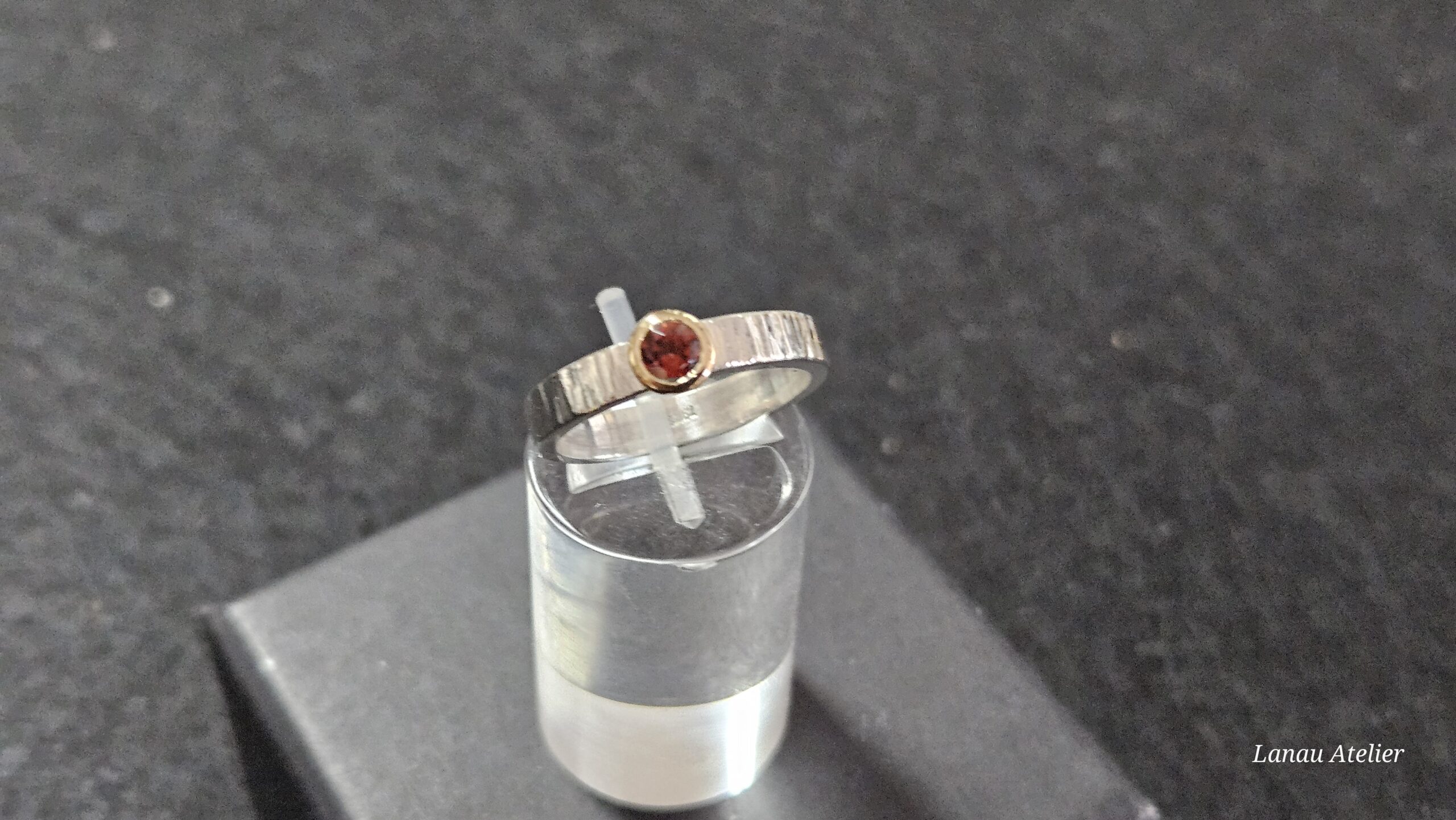 El granate, conocido por su intenso color rojo vino, simboliza la pasión, la energía y la protección, convirtiendo este anillo en mucho más que una joya: es una declaración personal. Su diseño versátil lo hace perfecto para usar a diario o para ocasiones especiales, y el contraste entre los metales nobles —plata martelé y oro amarillo— le aporta un toque contemporáneo y exclusivo.