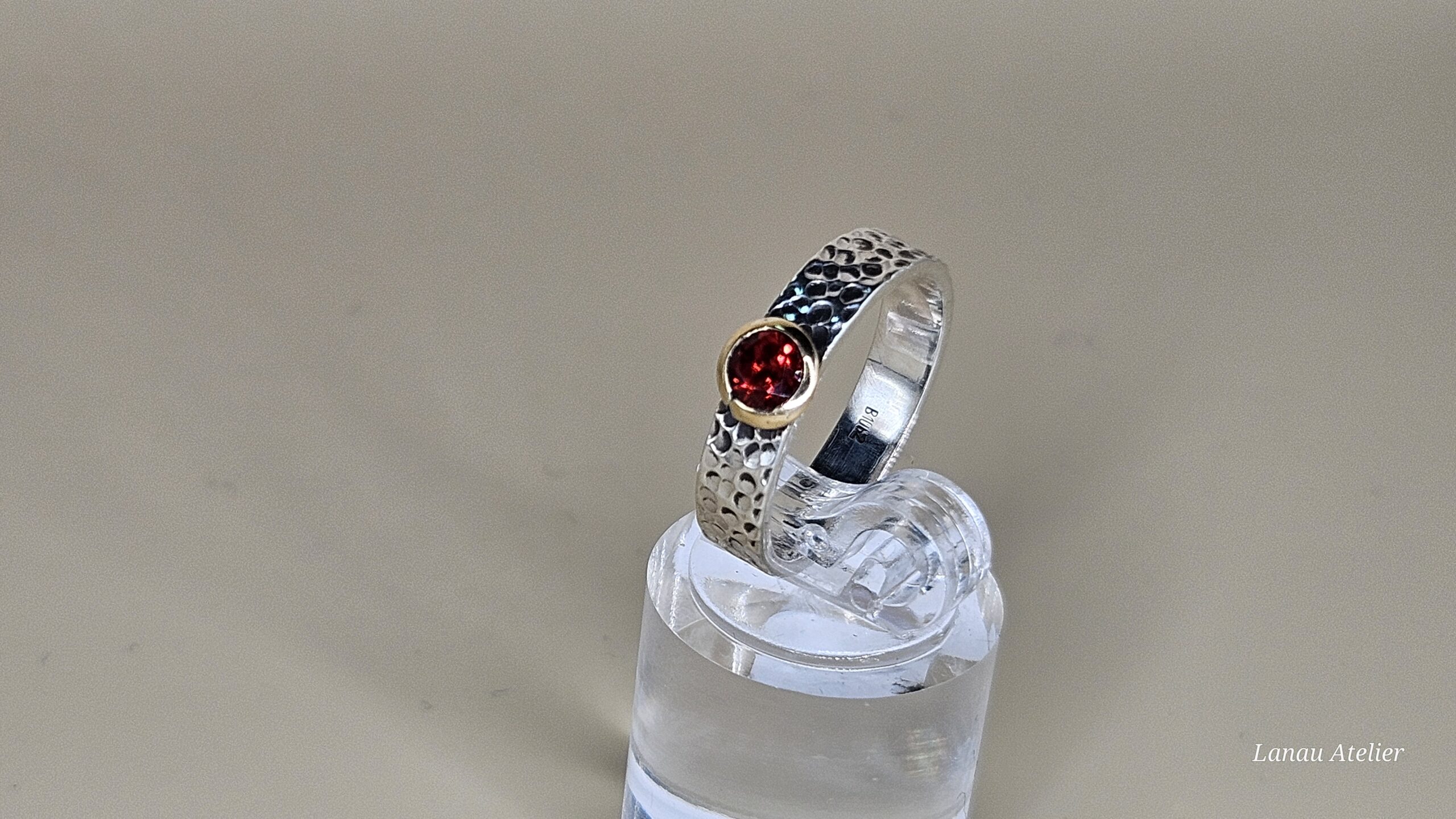 Este anillo combina la elegancia de la plata de ley con la distinción del oro de 18k en un engaste que realza la belleza del granate natural de 4 mm . La textura trabajada a mano en la banda de plata aporta carácter y autenticidad, mientras que el contraste del oro con el intenso rojo del granate lo convierte en una joya única y sofisticada.