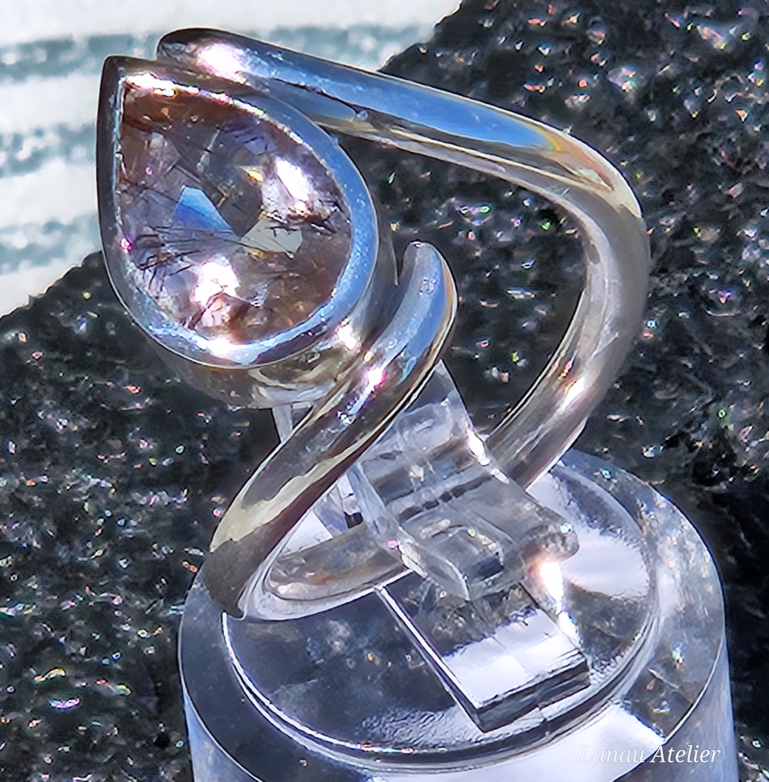 Pieza única y elegante, hecha a mano que combina la nobleza de la plata de ley con la belleza natural del cuarzo turmalinado en talla perilla lágrima de 13×9 mm. Su diseño abierto y fluido resalta la autenticidad y el carácter especial de esta gema, creando una joya llena de personalidad y estilo.