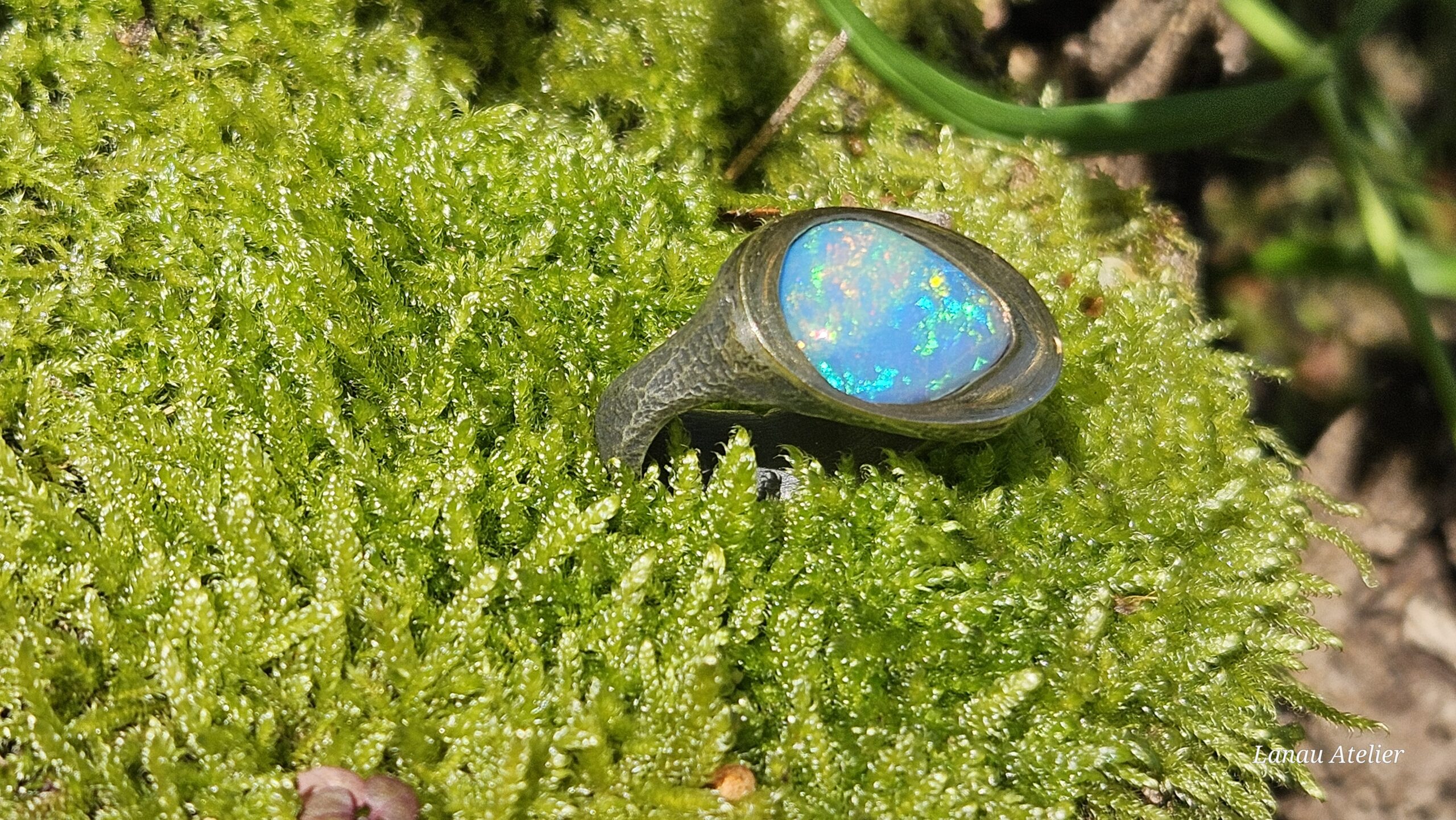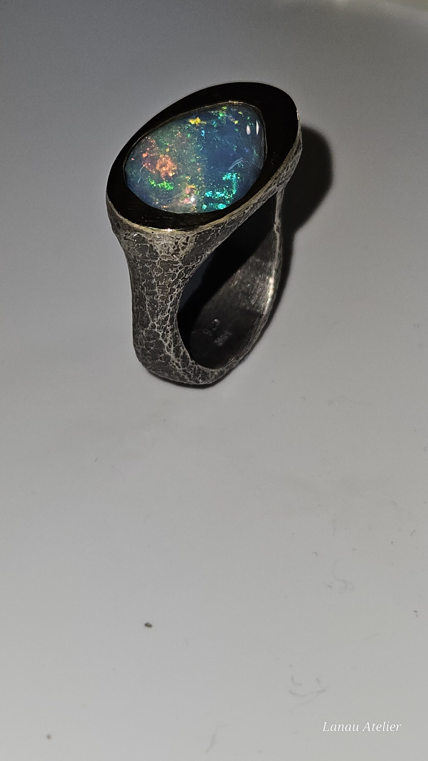 El protagonista es un ópalo etíope natural, conocido por su espectacular juego de colores, que varían desde tonos verdes y azules hasta destellos rojizos y dorados. Cada ópalo es diferente, lo que convierte a este anillo en una joya verdaderamente irrepetible.