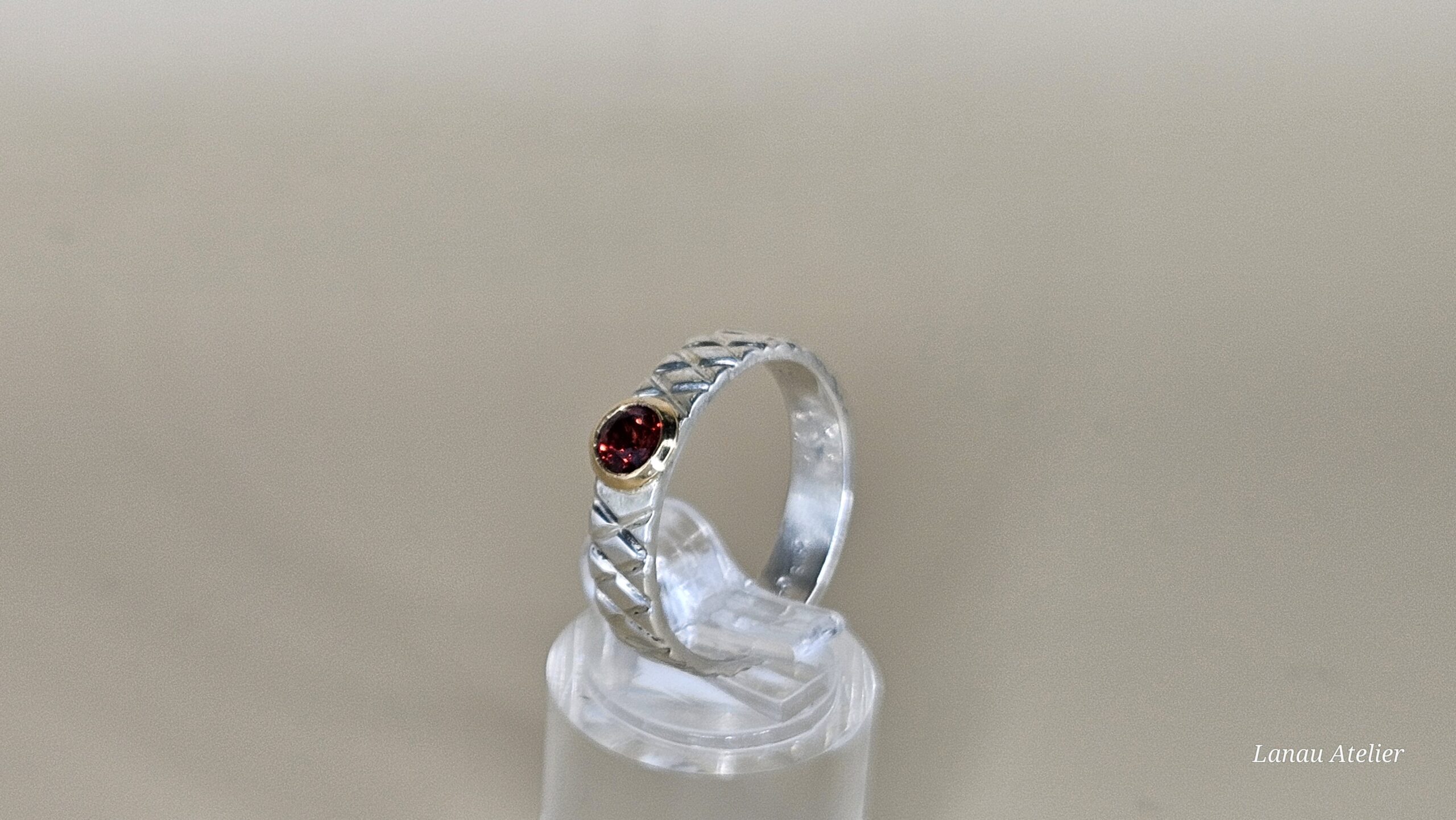 Este anillo combina la elegancia de la plata de ley con la distinción del oro de 18k en un engaste que realza la belleza del granate natural de 4 mm . La textura trabajada a mano en la banda de plata aporta carácter y autenticidad, mientras que el contraste del oro con el intenso rojo del granate lo convierte en una joya única y sofisticada.