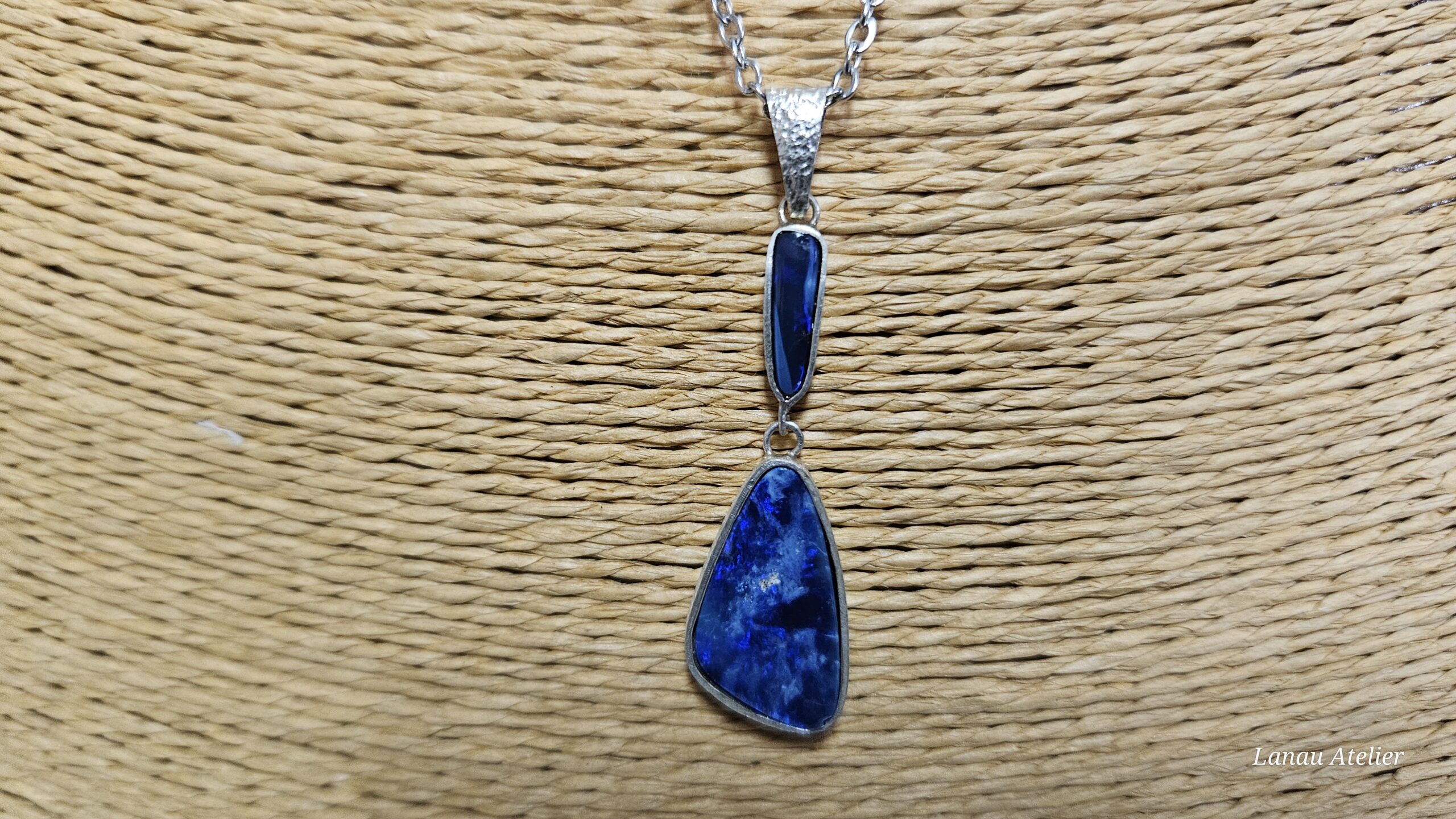 Este colgante de plata de ley con doble doblete de ópalo australiano es una joya artesanal creada a mano, donde el color profundo y cambiante del ópalo se convierte en el verdadero protagonista. Las dos piezas de ópalo, trabajadas en doblete, muestran reflejos azules intensos y destellos iridiscentes que varían con la luz y el movimiento, aportando una sensación de profundidad única.