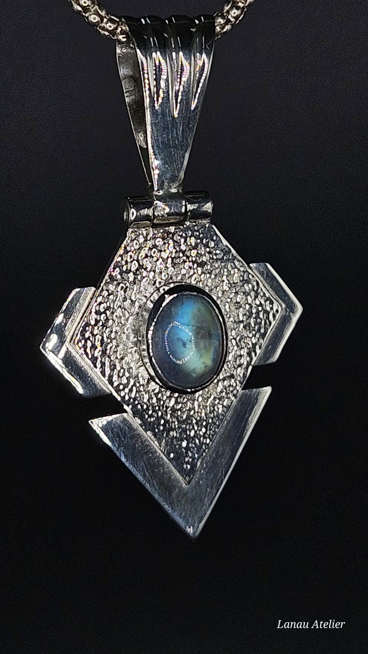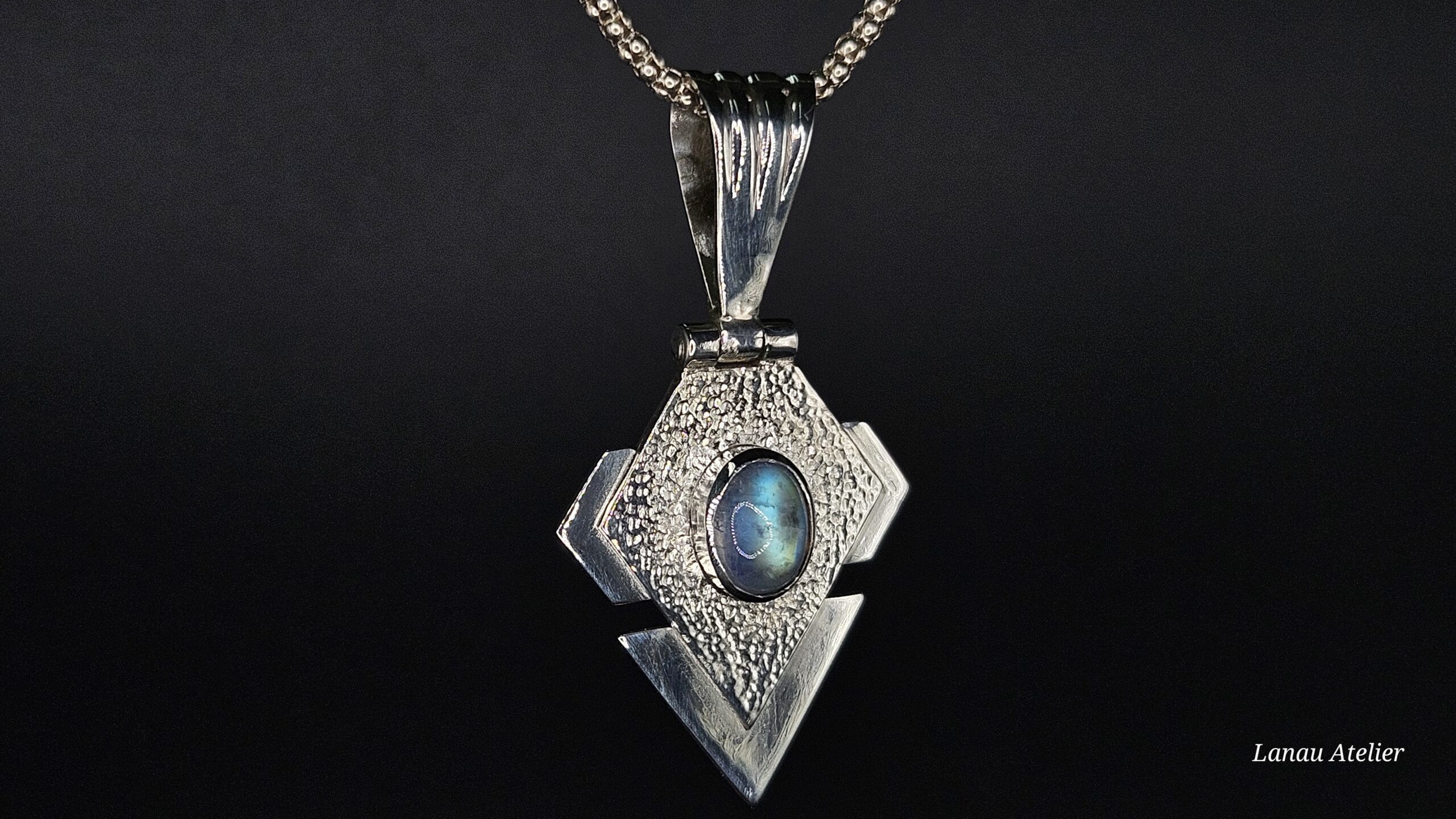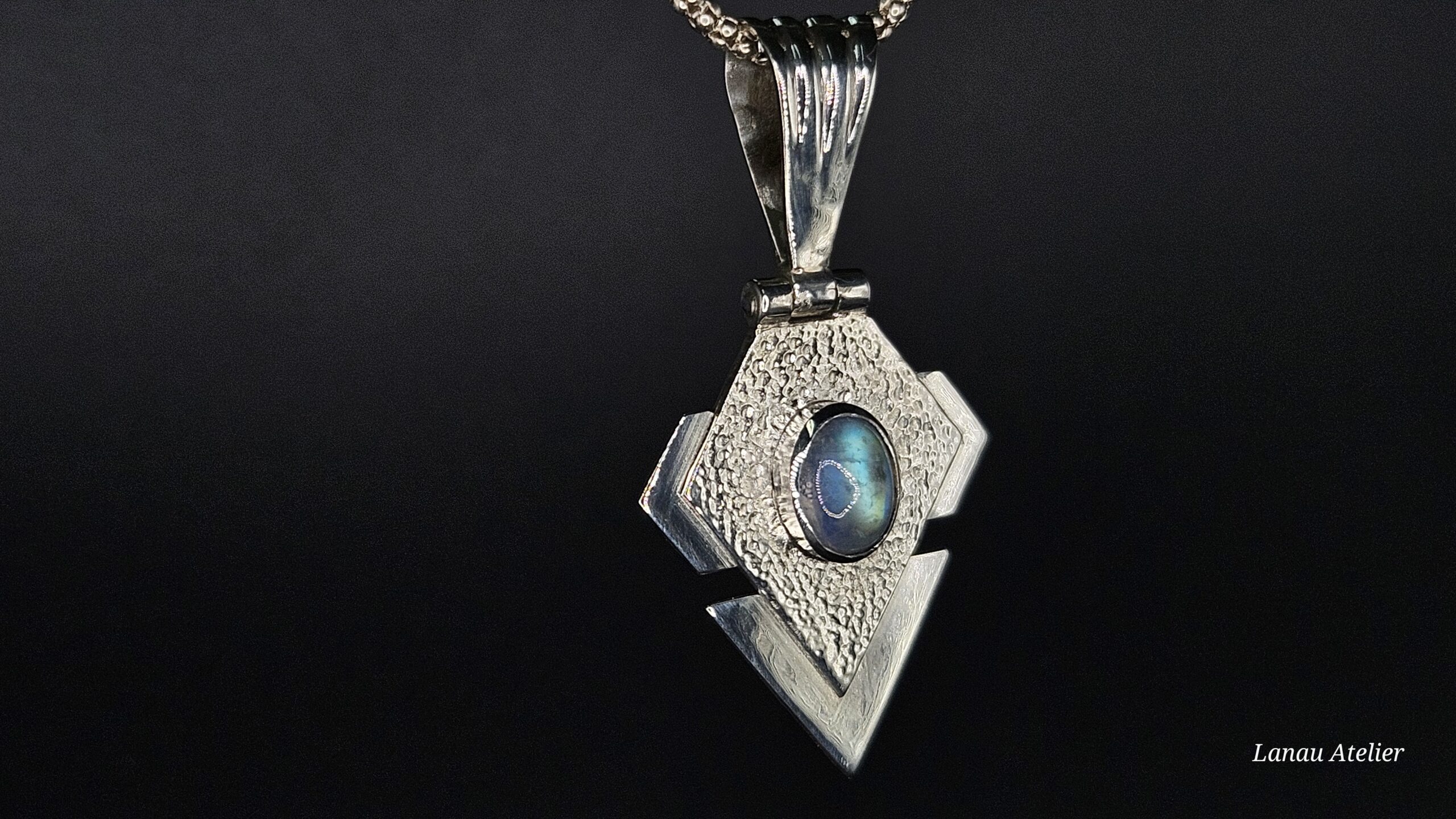 Este colgante artesanal de plata de ley con labradorita blanca es una joya única hecha a mano por Lanau Atelier. Su diseño geométrico contemporáneo y acabado texturizado destacan la belleza natural de una piedra semipreciosa muy especial: la labradorita blanca.