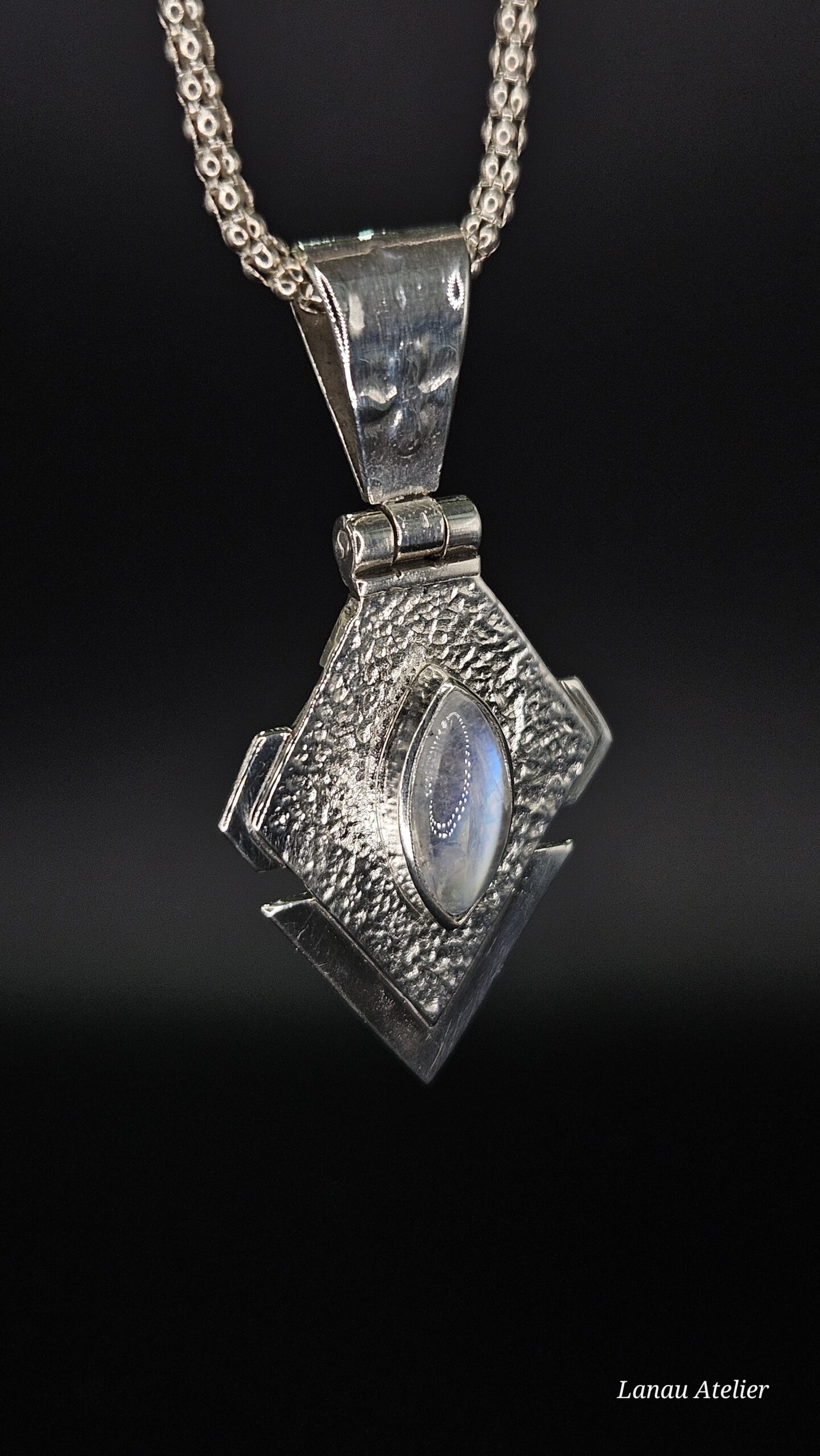 Descubre la belleza única de este colgante artesanal en plata de ley con labradorita blanca, una joya elaborada a mano por Lanau Atelier. Su diseño geométrico exclusivo y acabado texturizado lo convierten en una pieza contemporánea con alma tradicional.
