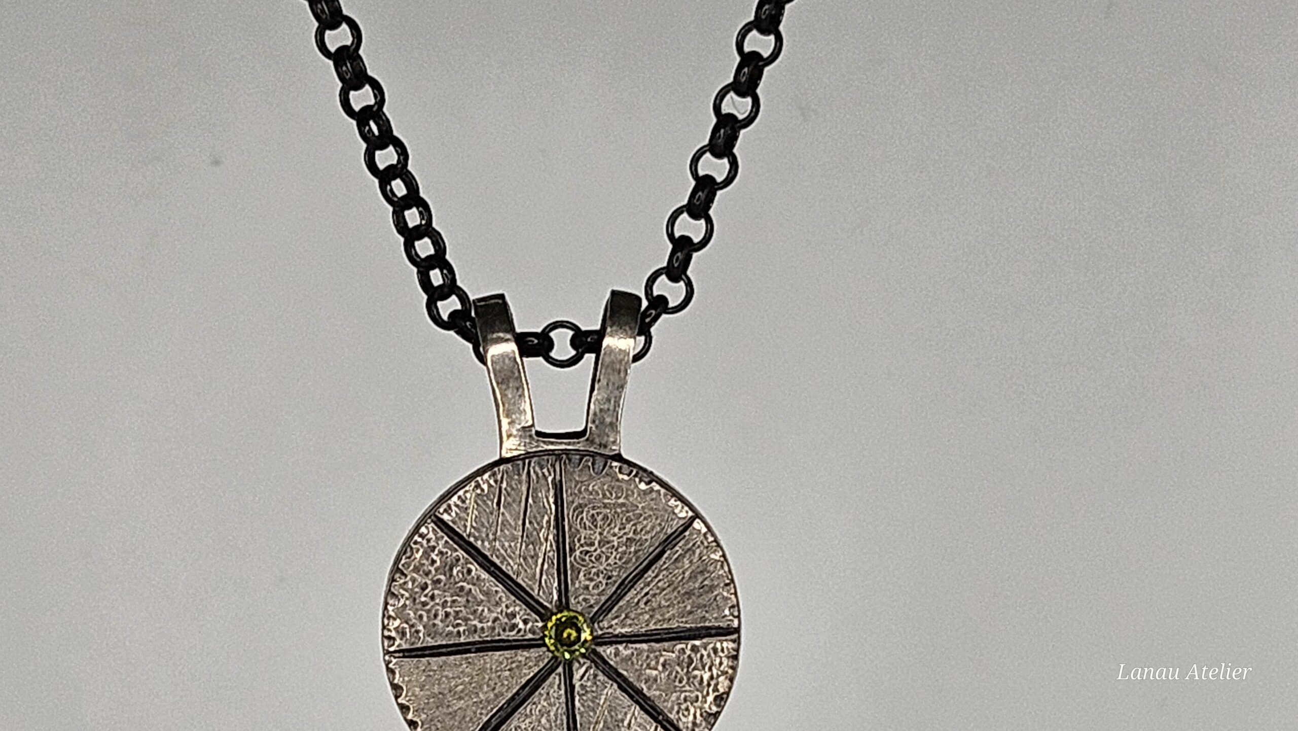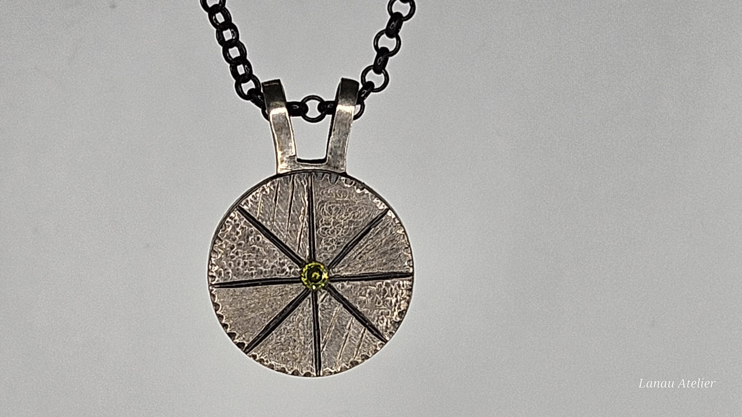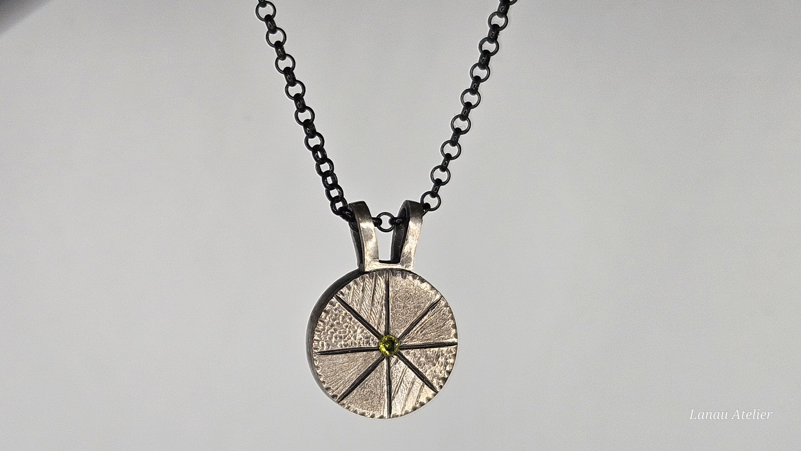 Colgante artesanal en forma de escudo, elaborado en plata de ley 925 con un acabado texturizado que aporta carácter y profundidad al diseño. En el centro, una circonita Dark Peridot de 2,25 mm añade un toque de color oscuro y misterioso que contrasta con la superficie metálica.