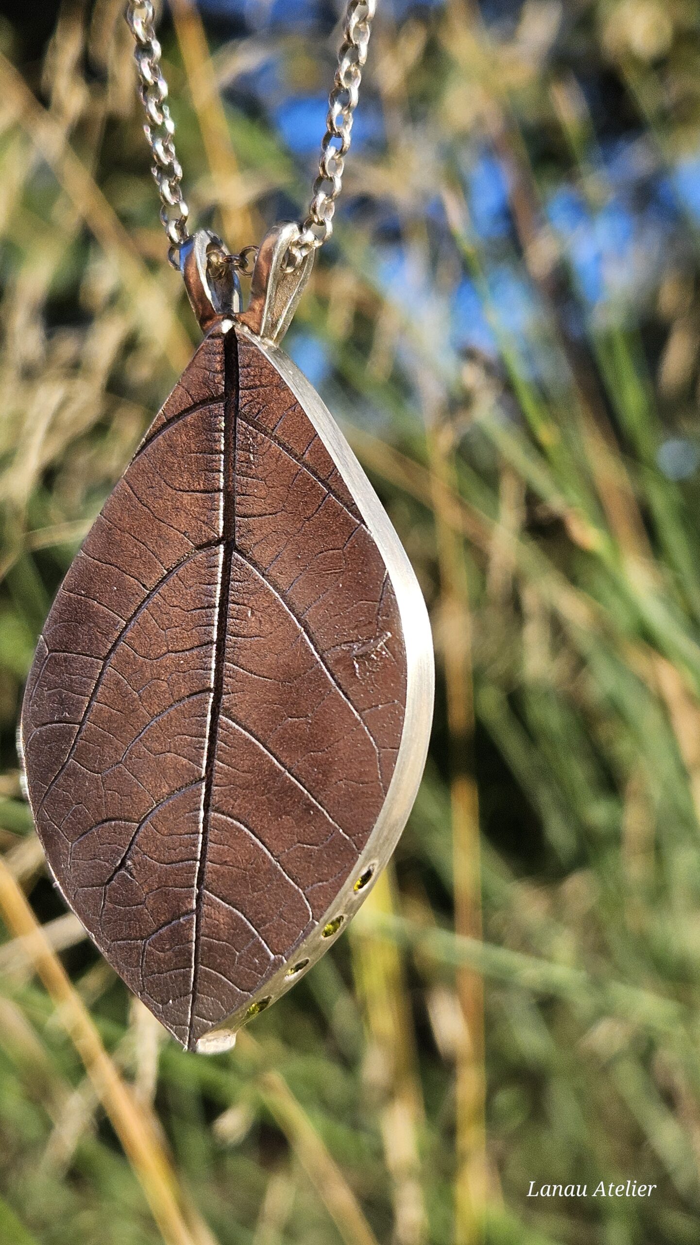 Colgante Reversible de Plata de Ley Texturizada en Forma de Hoja con Rubí en Bruto, Zoisita y 6 Circonitas Dark Peridot