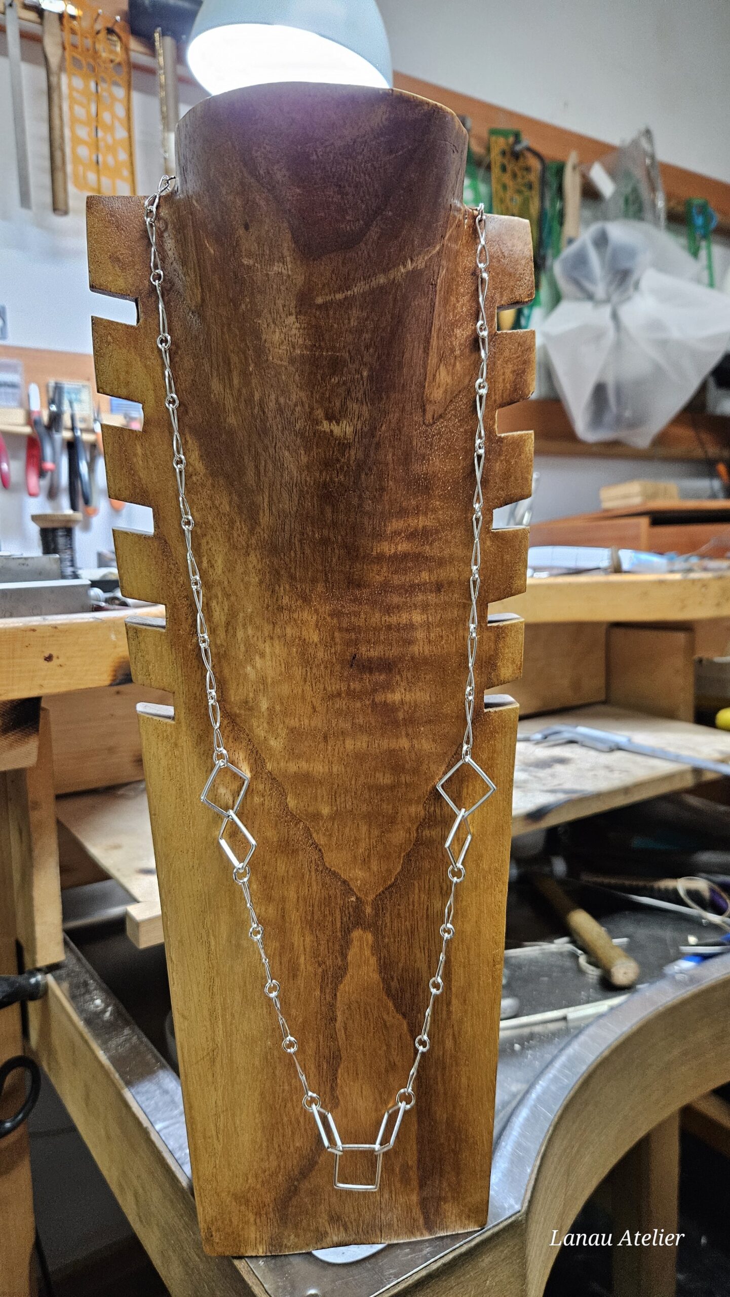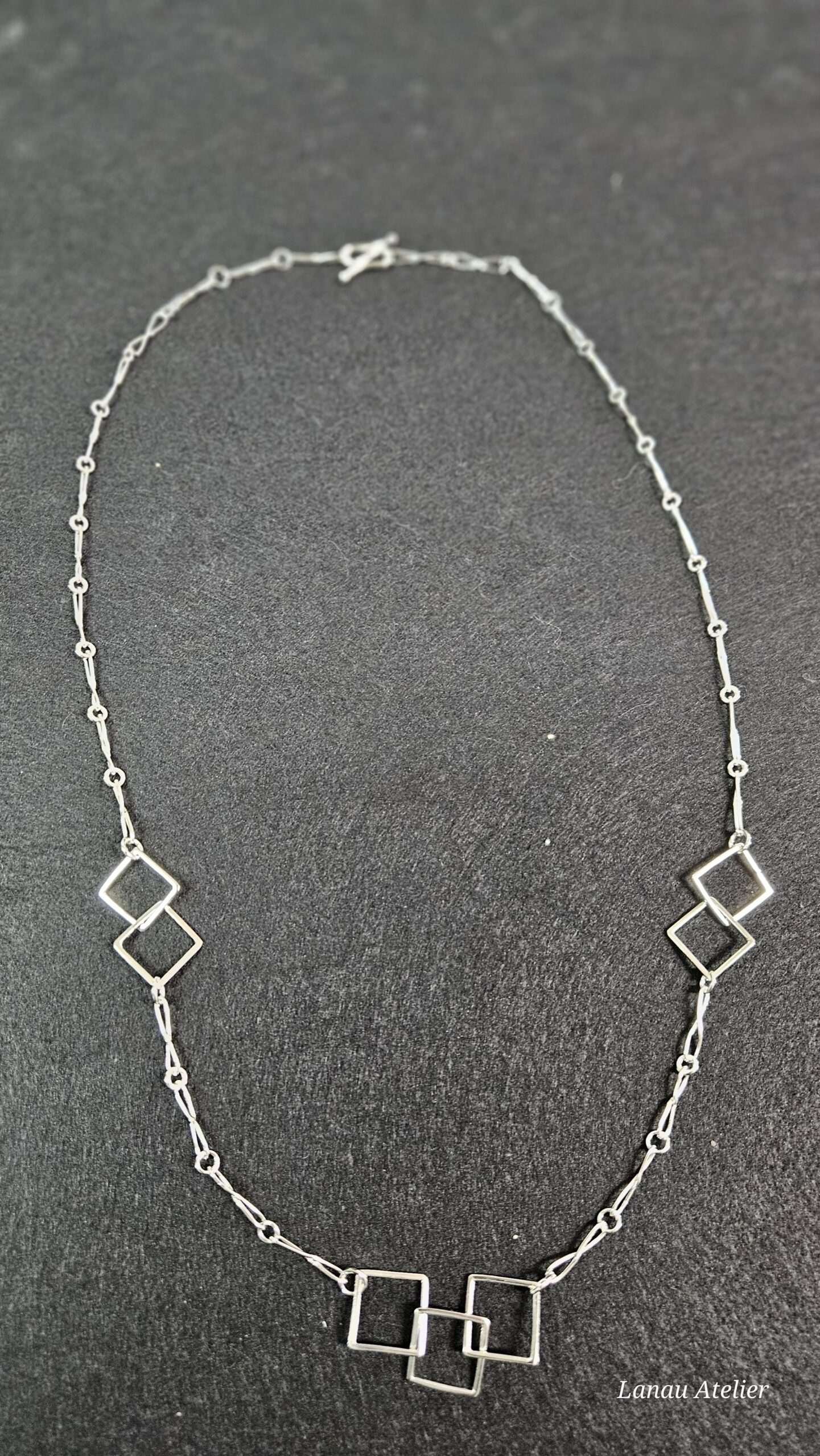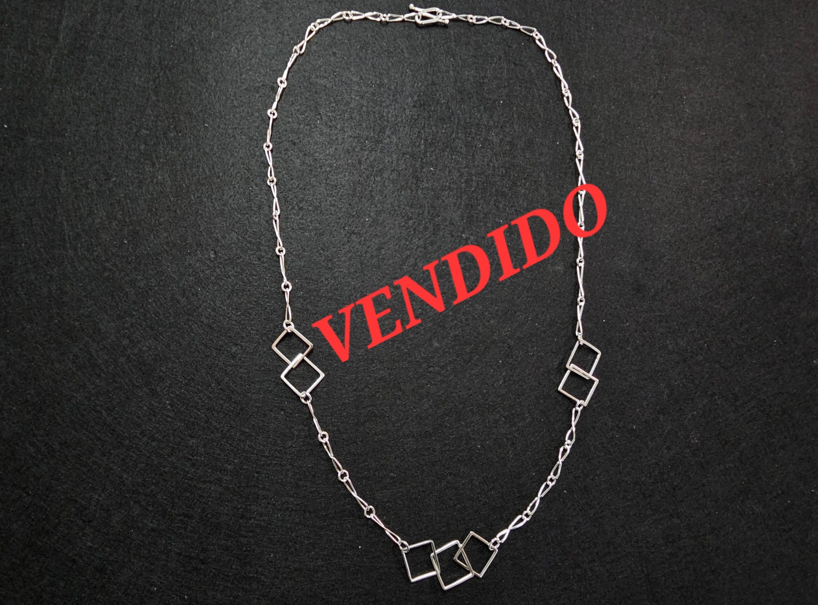 Descubre la elegancia minimalista con este collar de plata de ley 925, totalmente hecho a mano en nuestro taller artesanal. Esta pieza única destaca por su diseño geométrico contemporáneo, compuesto por eslabones irregulares y figuras de rombos y cuadrados cuidadosamente soldados uno a uno. El collar combina ligereza, modernidad y sofisticación, ideal para quienes buscan accesorios con carácter y originalidad.