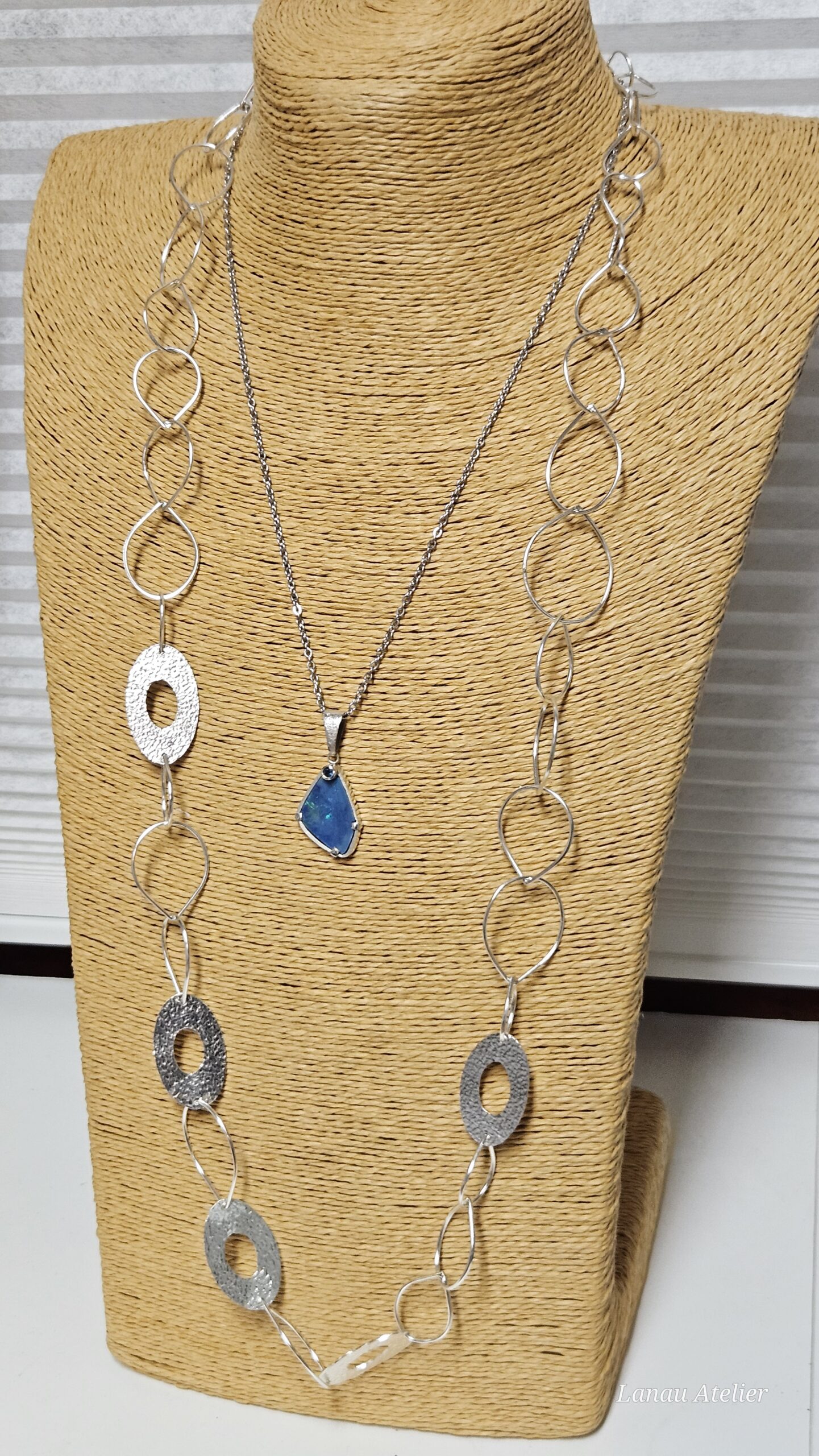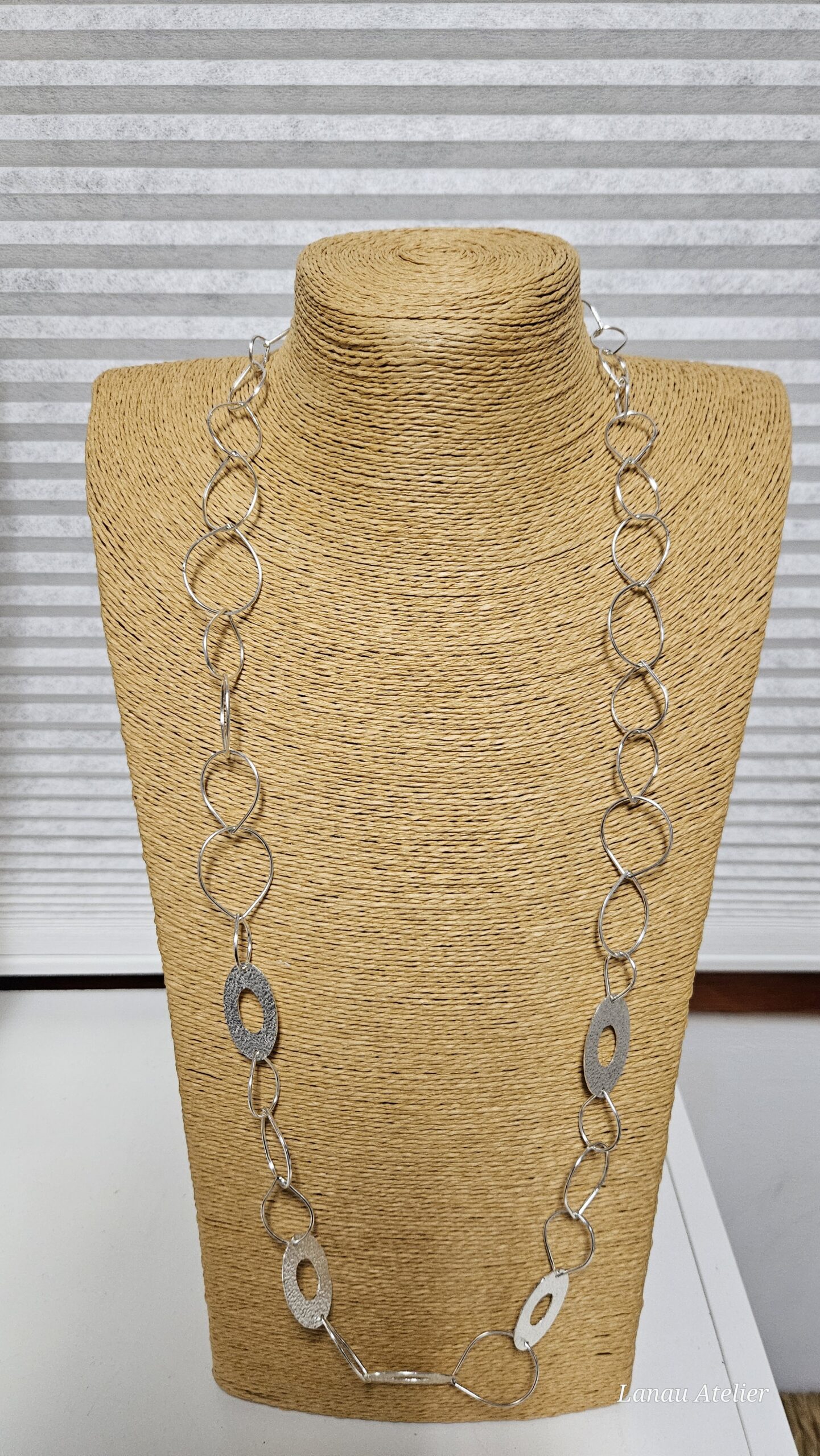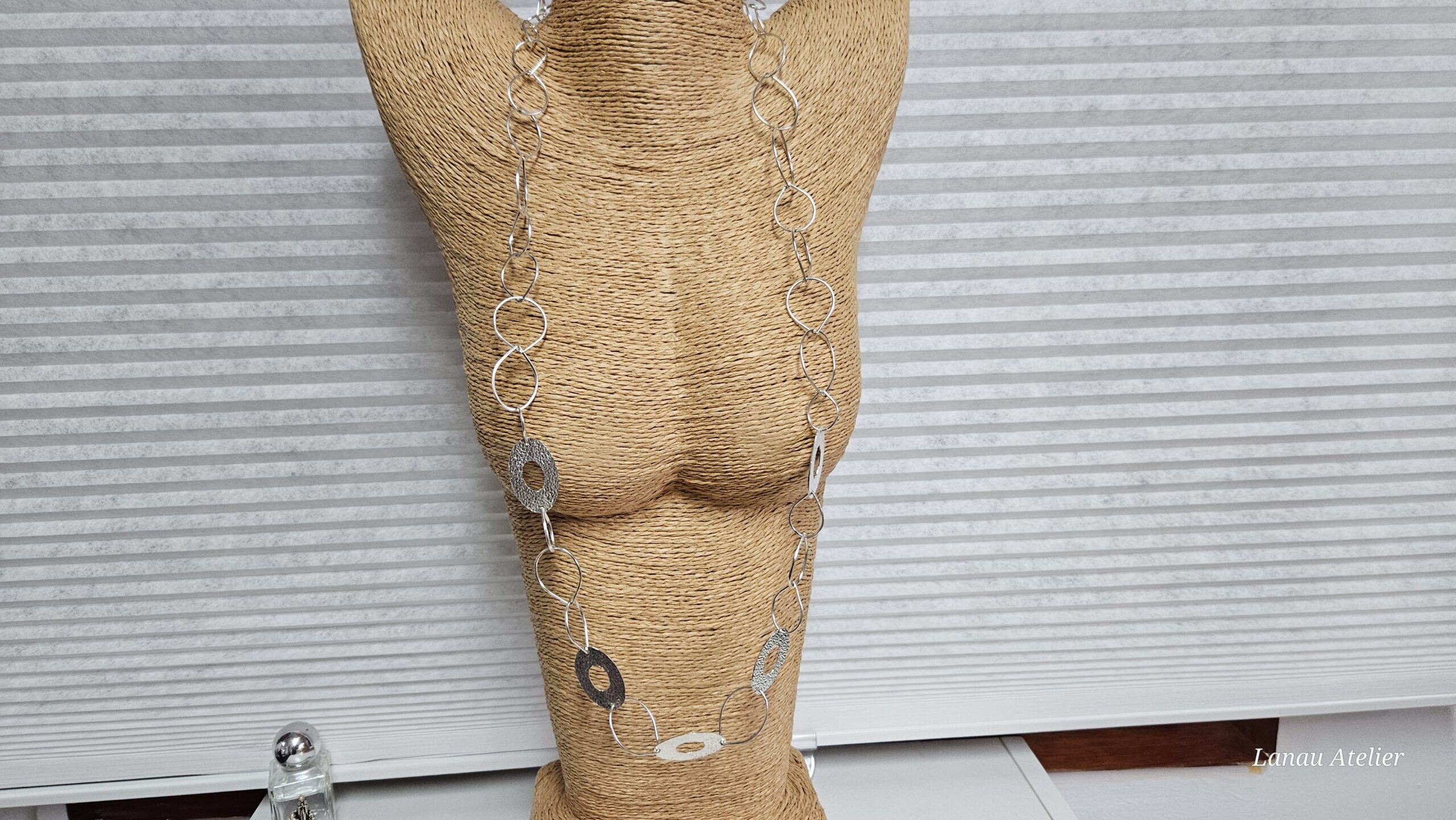 La plata ha sido trabajada artesanalmente, aplicando una textura manual que refuerza el carácter contemporáneo y atemporal del collar. Su longitud permite llevarlo solo o combinado con otras piezas, convirtiéndolo en un collar versátil, elegante y con presencia, pensado para acompañar tanto looks cotidianos como ocasiones especiales.