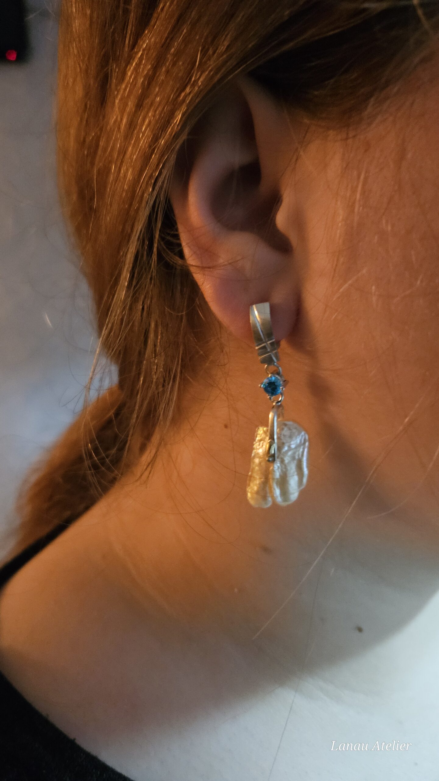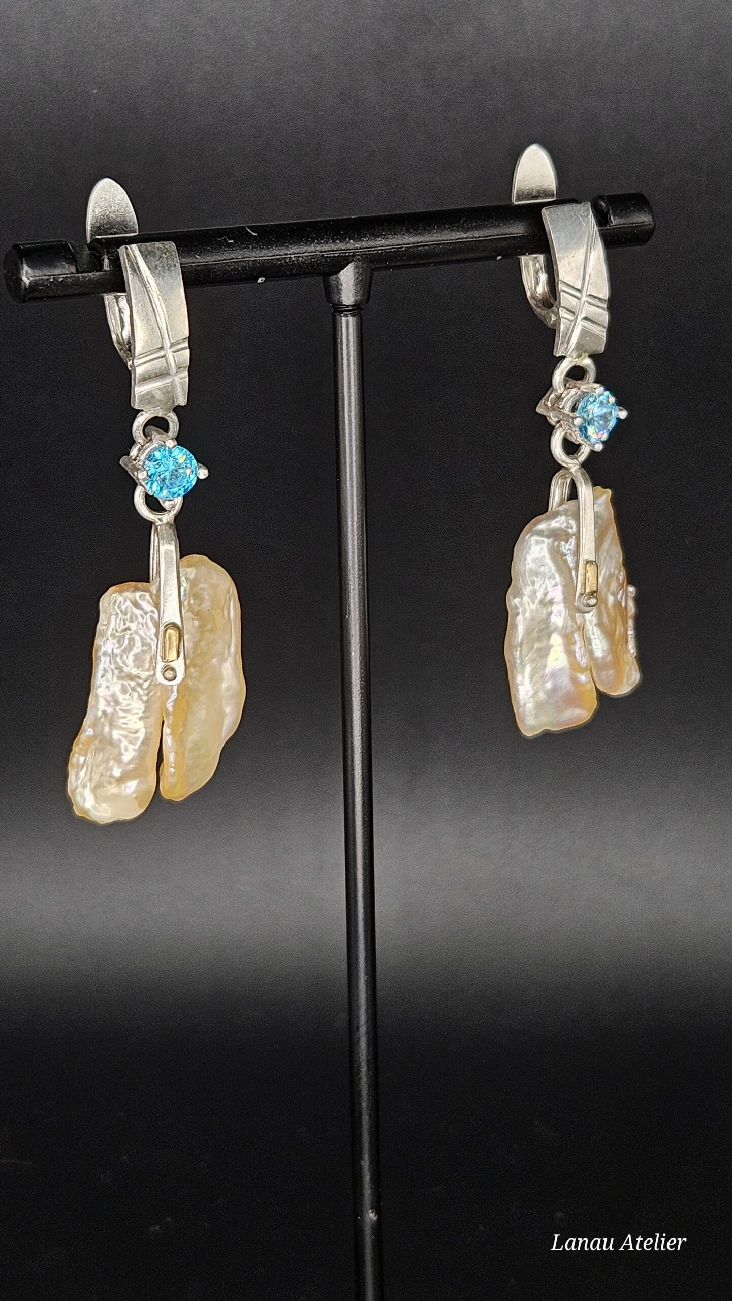 ✨ Pendientes en Plata de Ley, Oro 18K, Topacio Swiss Blue y Perlas Barrocas con Cierre Catalán ✨