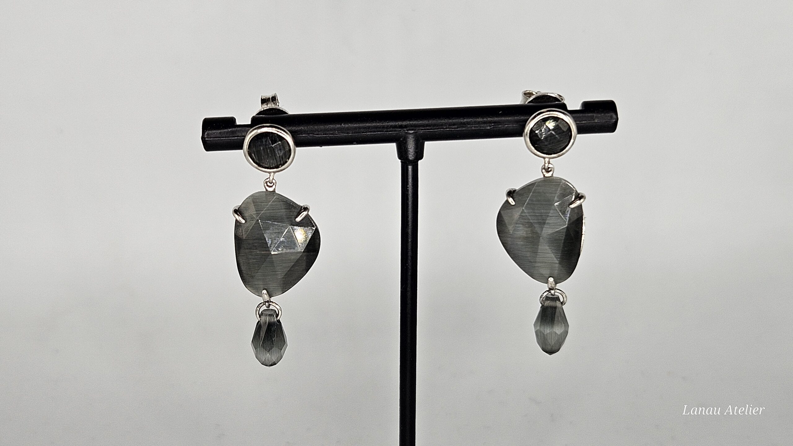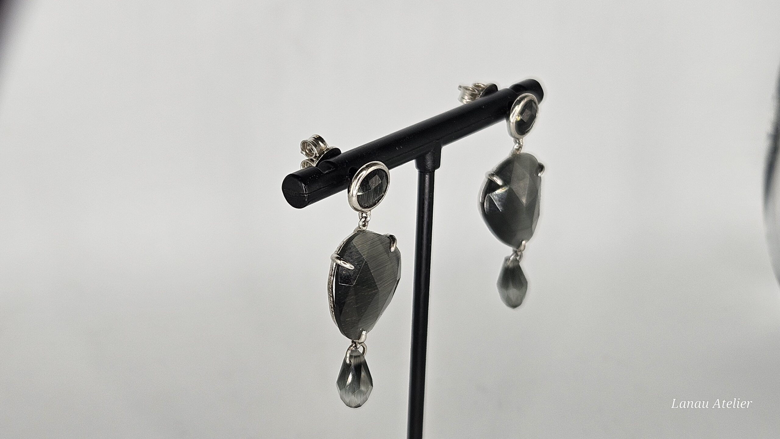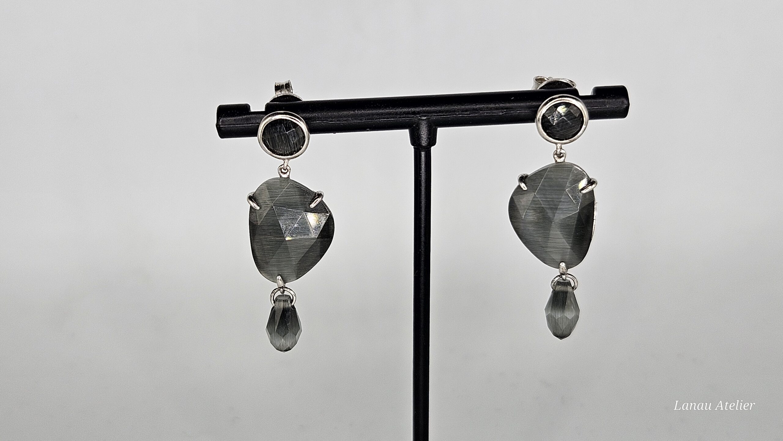 Diseñados para chicas muy especiales, estos pendientes de plata de ley combinan movimiento, brillo y estilo en una joya única y cautivadora. Cada pendiente presenta tres niveles articulados con piedras tipo “ojo de gato”, conocidas por su efecto sedoso y reflejos mágicos al cambiar la luz. Una elección perfecta para quienes buscan destacar con elegancia y originalidad.