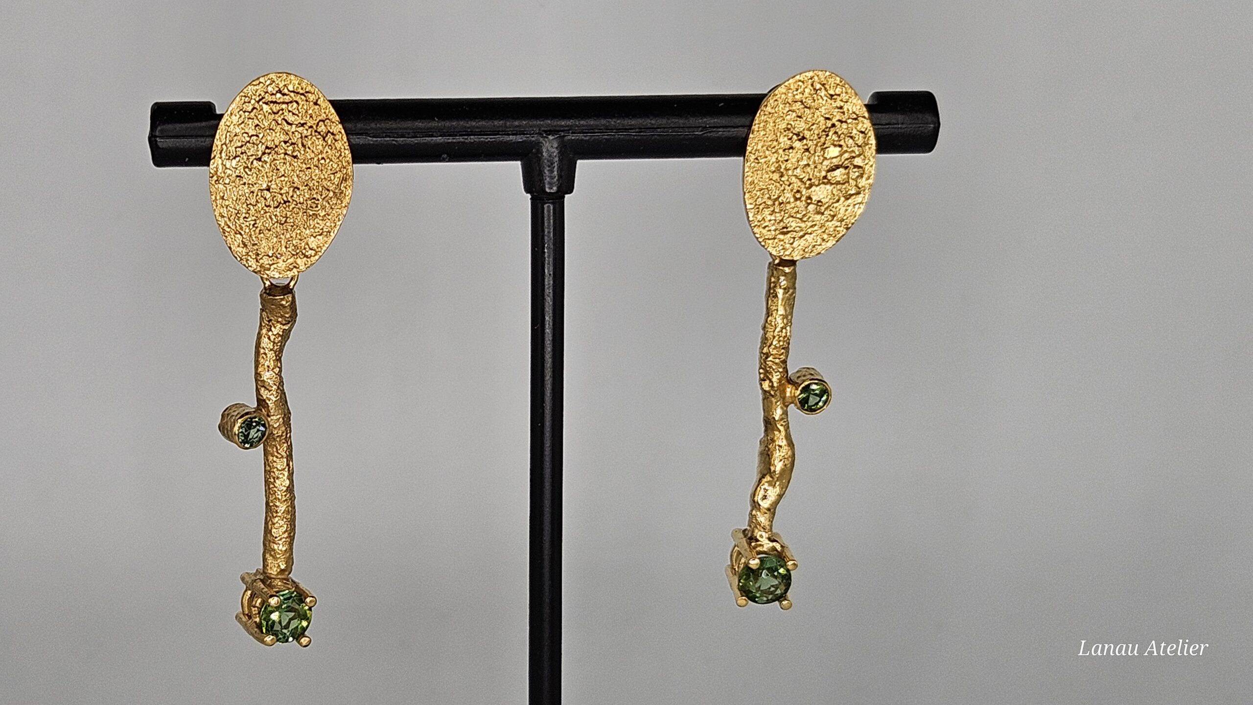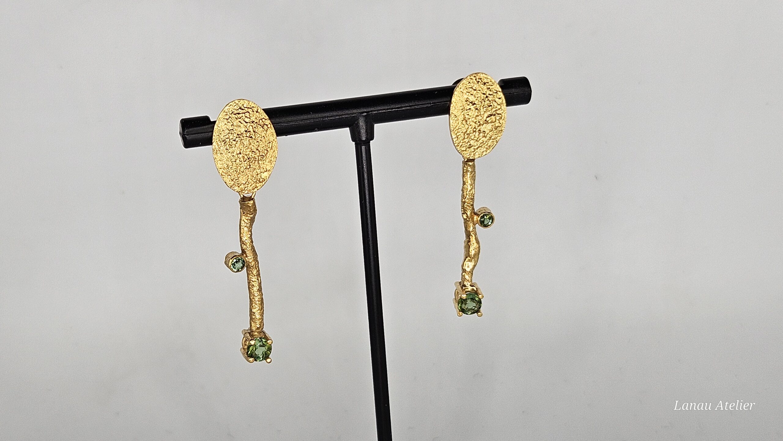 Cuatro turmalinas naturales brasileñas de 3 mm y 4,3 mm, en tonos que varían como el paisaje según la luz, aportan un toque de color sutil y elegante.
