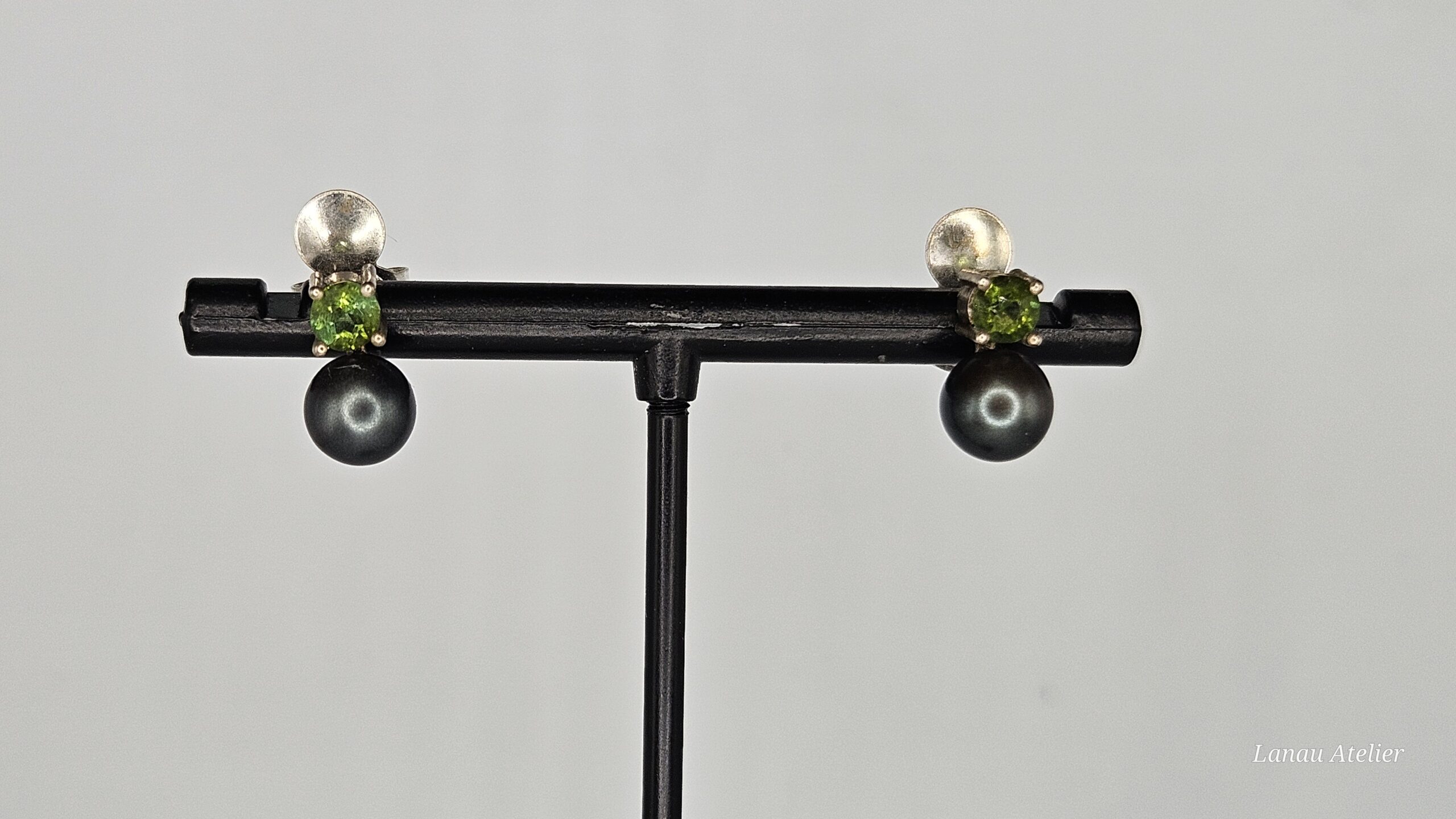 🔹 Piedras: Turmalinas verdes naturales (4.3mm) y perla negra cultivada